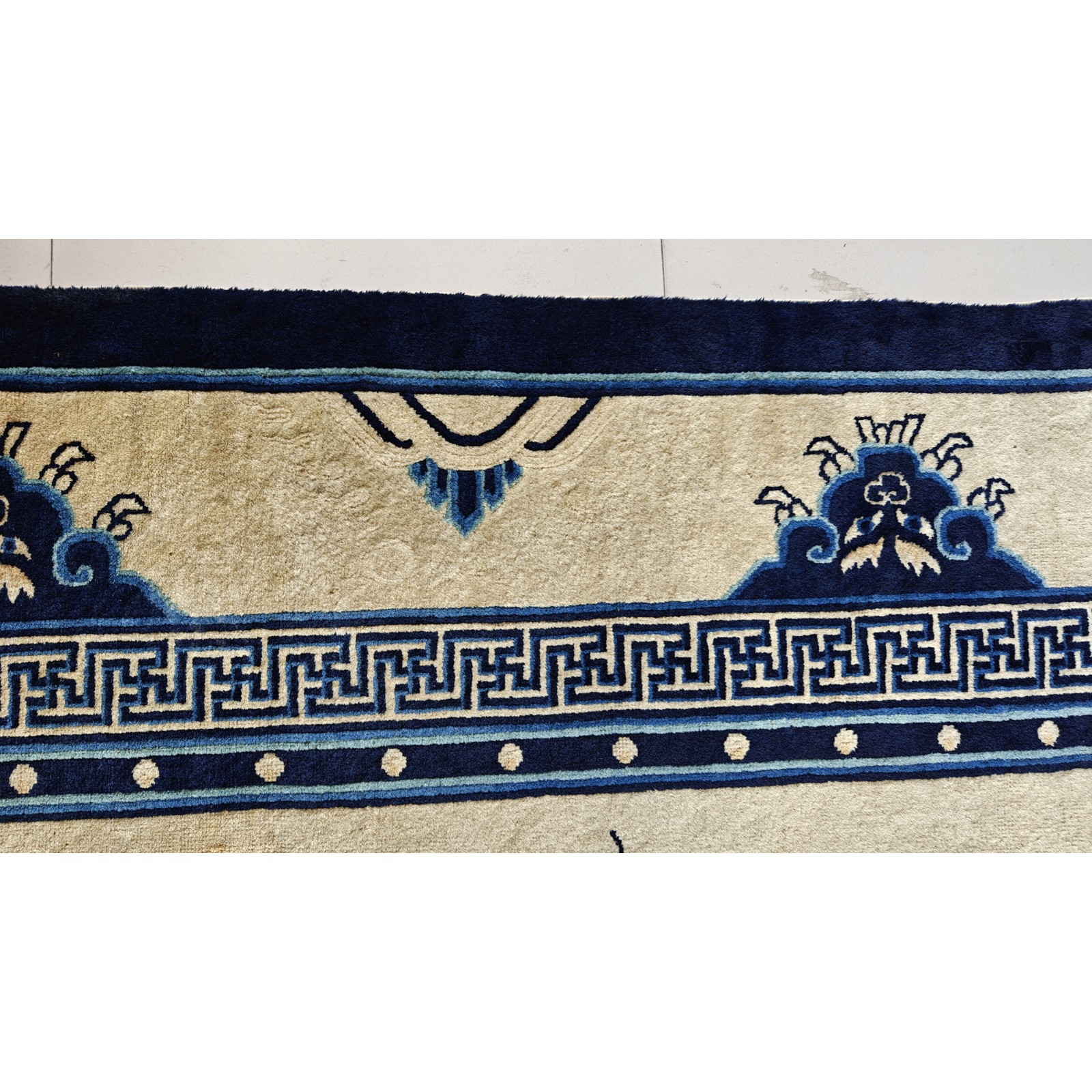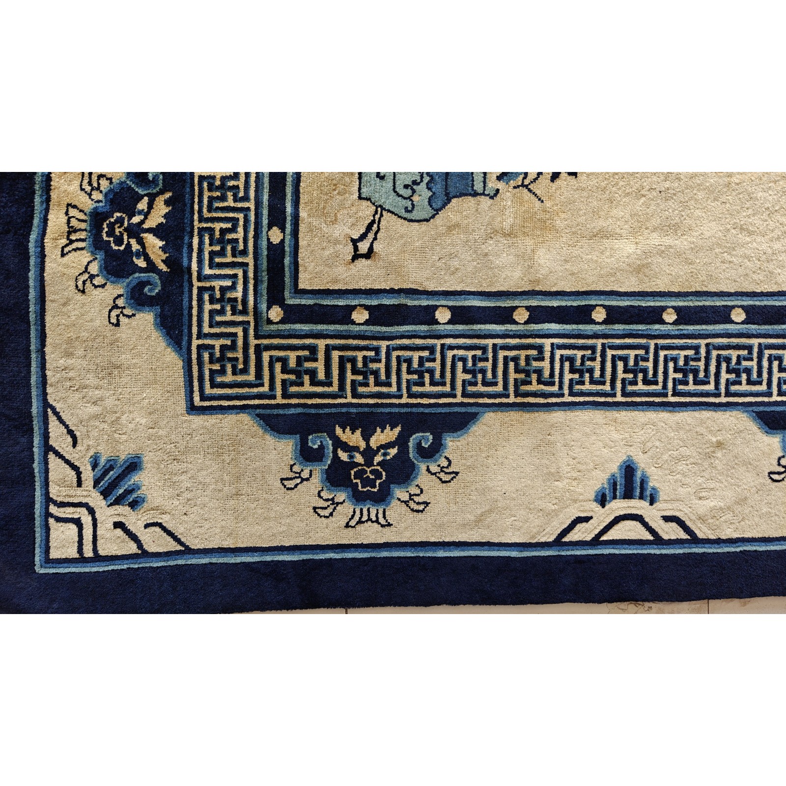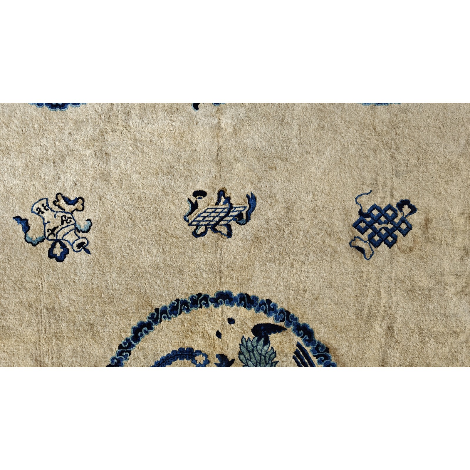 | DescriptionChineseCarpets made in China proper. See entries Ningshia, Peking, Art Deco. Chinese - PekingThe commercial Peking carpet is a later 19th century development, begun by importing weaves from Ningshia (see entry) to create and export industry aimed at Western markets. The foundation is cotton and the pile is a good quality carpet wool which takes dyes particularly well. The neat medium weave is in Persian (asymmetric) knots. Designs are strictly Chinese and the whole motif repertoire of Chinese art is employed. Blue and white is the most popular color combination and red is particularly rare. Sizes tend to 9 x 12 and larger, and few small pieces appear. For a short time in the early 1920s Persian designs were woven to capitalize on the death of new Iranian goods. The industry decimated by the Communist Revolution relocated to the Pearl River area. There is a good supply of antique carpets at reasonable prices. | |