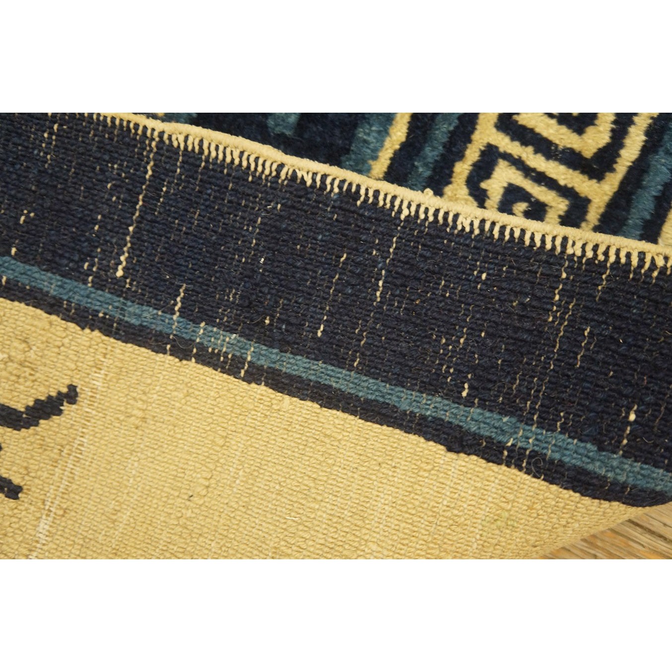 DescriptionChineseCarpets made in China proper. See entries Ningshia, Peking, Art Deco. Chinese - PekingThe commercial Peking carpet is a later 19th century development, begun by importing weaves from Ningshia (see entry) to create and export industry aimed at Western markets. The foundation is cotton and the pile is a good quality carpet wool which takes dyes particularly well. The neat medium weave is in Persian (asymmetric) knots. Designs are strictly Chinese and the whole motif repertoire of Chinese art is employed. Blue and white is the most popular color combination and red is particularly rare. Sizes tend to 9 x 12 and larger, and few small pieces appear. For a short time in the early 1920s Persian designs were woven to capitalize on the death of new Iranian goods. The industry decimated by the Communist Revolution relocated to the Pearl River area. There is a good supply of antique carpets at reasonable prices. | |