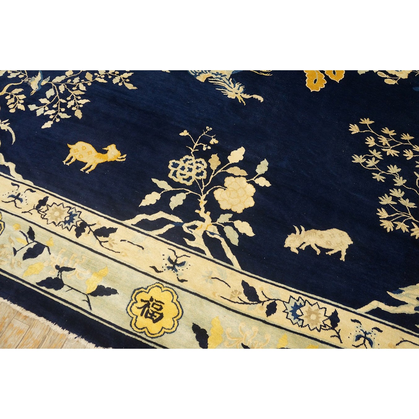 DescriptionChineseCarpets made in China proper. See entries Ningshia, Peking, Art Deco. Chinese - PekingThe commercial Peking carpet is a later 19th century development, begun by importing weaves from Ningshia (see entry) to create and export industry aimed at Western markets. The foundation is cotton and the pile is a good quality carpet wool which takes dyes particularly well. The neat medium weave is in Persian (asymmetric) knots. Designs are strictly Chinese and the whole motif repertoire of Chinese art is employed. Blue and white is the most popular color combination and red is particularly rare. Sizes tend to 9 x 12 and larger, and few small pieces appear. For a short time in the early 1920s Persian designs were woven to capitalize on the death of new Iranian goods. The industry decimated by the Communist Revolution relocated to the Pearl River area. There is a good supply of antique carpets at reasonable prices. | |