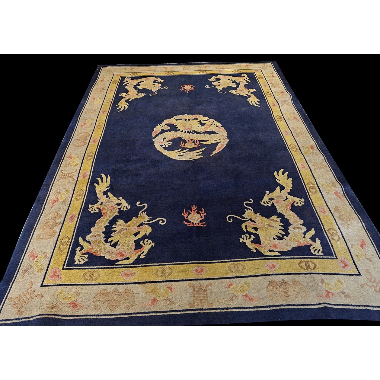 DescriptionChineseCarpets made in China proper. See entries Ningshia, Peking, Art Deco. Chinese - PekingThe commercial Peking carpet is a later 19th century development, begun by importing weaves from Ningshia (see entry) to create and export industry aimed at Western markets. The foundation is cotton and the pile is a good quality carpet wool which takes dyes particularly well. The neat medium weave is in Persian (asymmetric) knots. Designs are strictly Chinese and the whole motif repertoire of Chinese art is employed. Blue and white is the most popular color combination and red is particularly rare. Sizes tend to 9 x 12 and larger, and few small pieces appear. For a short time in the early 1920s Persian designs were woven to capitalize on the death of new Iranian goods. The industry decimated by the Communist Revolution relocated to the Pearl River area. There is a good supply of antique carpets at reasonable prices. | |