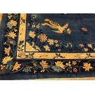 DescriptionChineseCarpets made in China proper. See entries Ningshia, Peking, Art Deco. Chinese - PekingThe commercial Peking carpet is a later 19th century development, begun by importing weaves from Ningshia (see entry) to create and export industry aimed at Western markets. The foundation is cotton and the pile is a good quality carpet wool which takes dyes particularly well. The neat medium weave is in Persian (asymmetric) knots. Designs are strictly Chinese and the whole motif repertoire of Chinese art is employed. Blue and white is the most popular color combination and red is particularly rare. Sizes tend to 9 x 12 and larger, and few small pieces appear. For a short time in the early 1920s Persian designs were woven to capitalize on the death of new Iranian goods. The industry decimated by the Communist Revolution relocated to the Pearl River area. There is a good supply of antique carpets at reasonable prices. | |