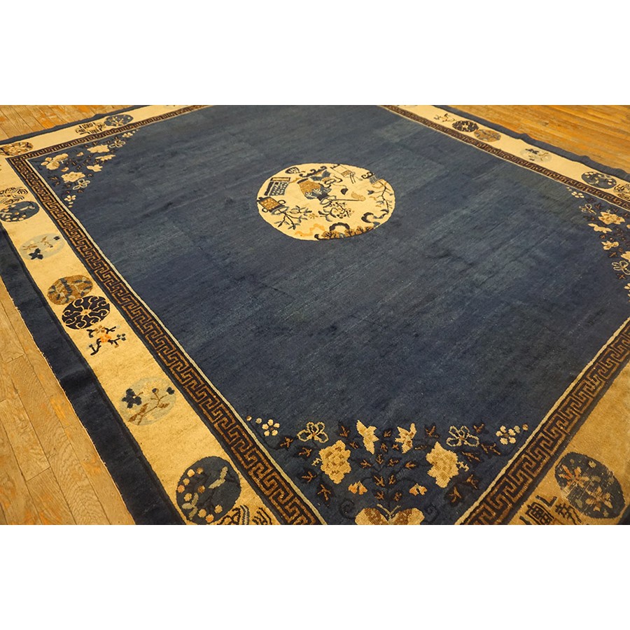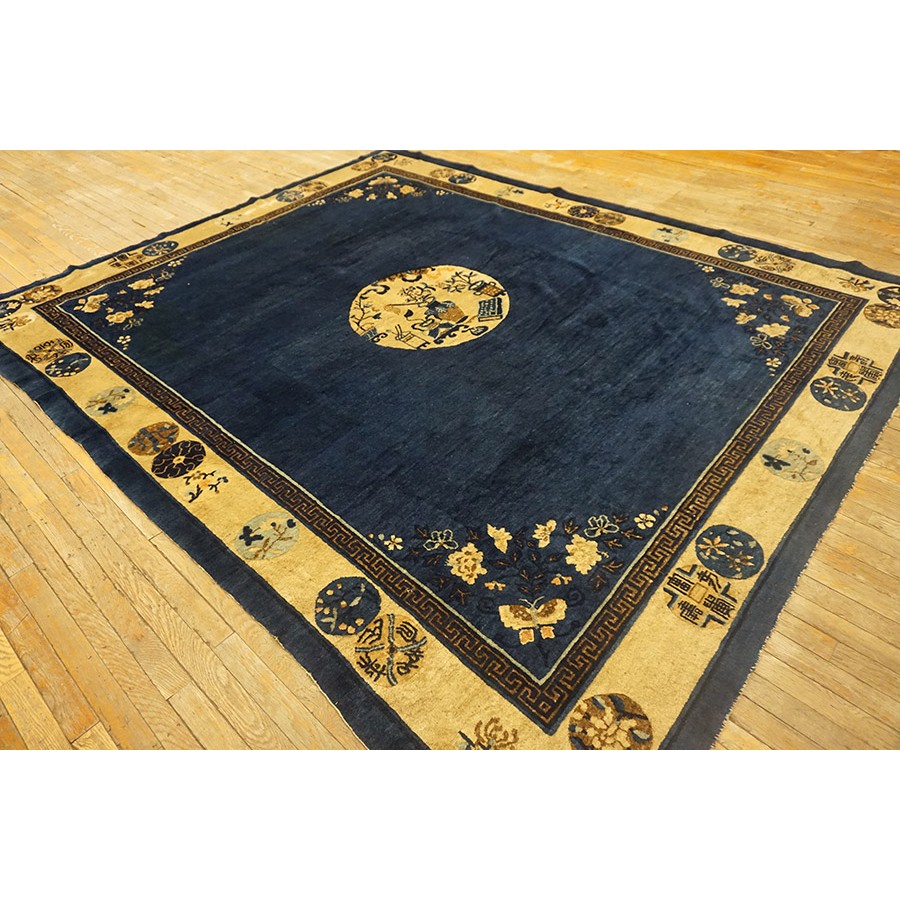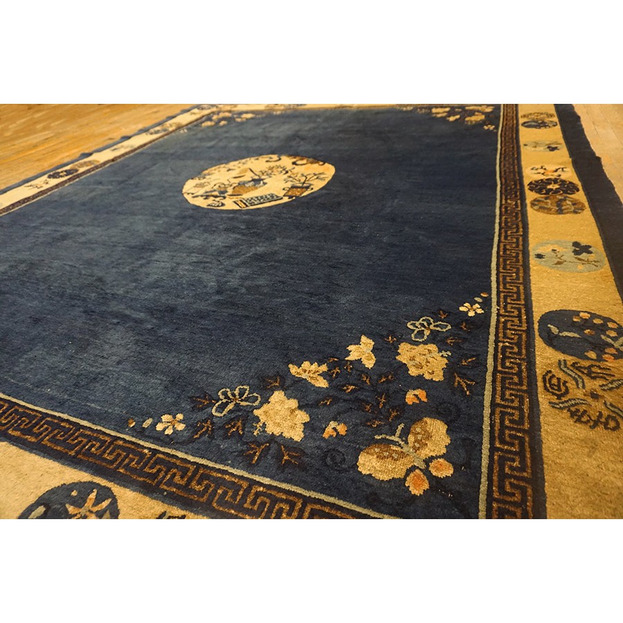 DescriptionChineseCarpets made in China proper. See entries Ningshia, Peking, Art Deco. Chinese - PekingThe commercial Peking carpet is a later 19th century development, begun by importing weaves from Ningshia (see entry) to create and export industry aimed at Western markets. The foundation is cotton and the pile is a good quality carpet wool which takes dyes particularly well. The neat medium weave is in Persian (asymmetric) knots. Designs are strictly Chinese and the whole motif repertoire of Chinese art is employed. Blue and white is the most popular color combination and red is particularly rare. Sizes tend to 9 x 12 and larger, and few small pieces appear. For a short time in the early 1920s Persian designs were woven to capitalize on the death of new Iranian goods. The industry decimated by the Communist Revolution relocated to the Pearl River area. There is a good supply of antique carpets at reasonable prices. | |