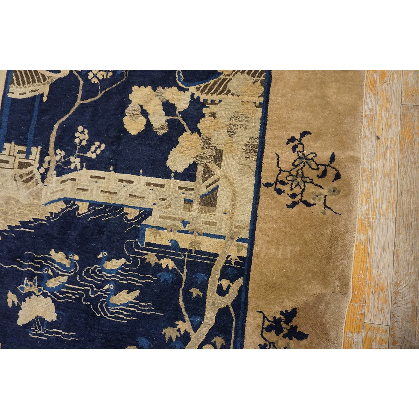 DescriptionChineseCarpets made in China proper. See entries Ningshia, Peking, Art Deco. Chinese - PekingThe commercial Peking carpet is a later 19th century development, begun by importing weaves from Ningshia (see entry) to create and export industry aimed at Western markets. The foundation is cotton and the pile is a good quality carpet wool which takes dyes particularly well. The neat medium weave is in Persian (asymmetric) knots. Designs are strictly Chinese and the whole motif repertoire of Chinese art is employed. Blue and white is the most popular color combination and red is particularly rare. Sizes tend to 9 x 12 and larger, and few small pieces appear. For a short time in the early 1920s Persian designs were woven to capitalize on the death of new Iranian goods. The industry decimated by the Communist Revolution relocated to the Pearl River area. There is a good supply of antique carpets at reasonable prices. | |
