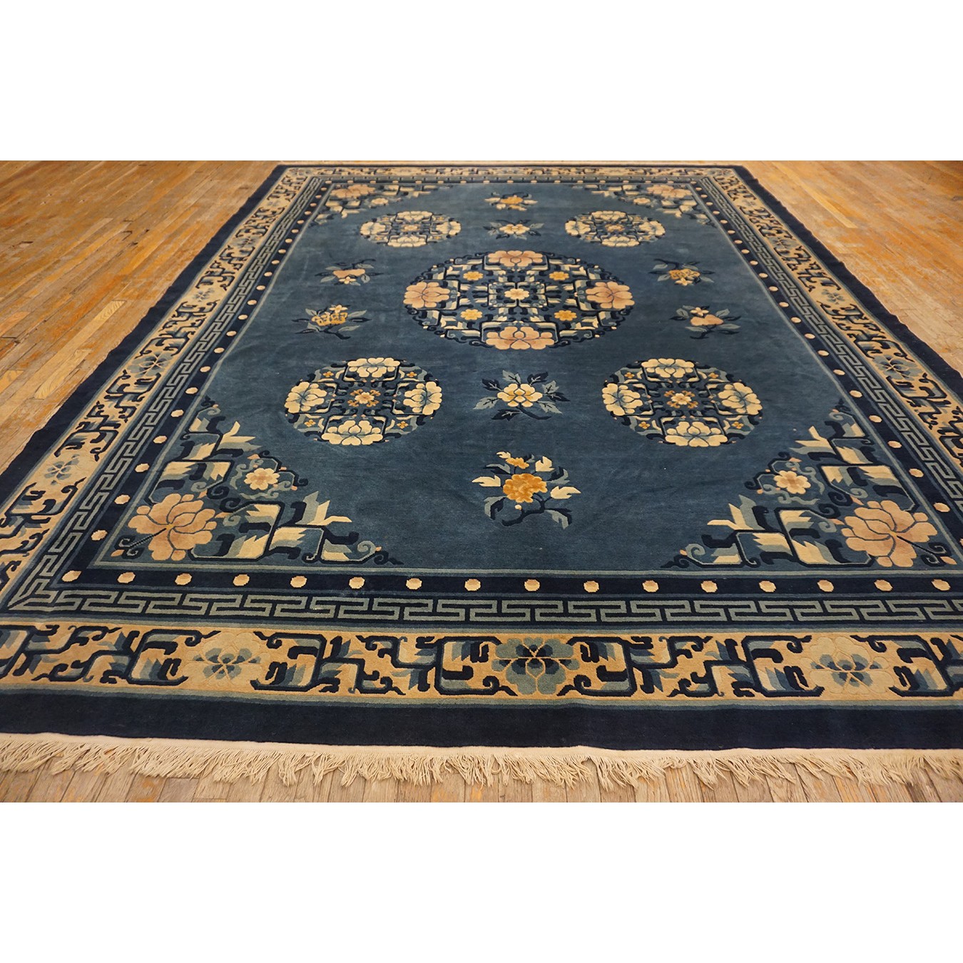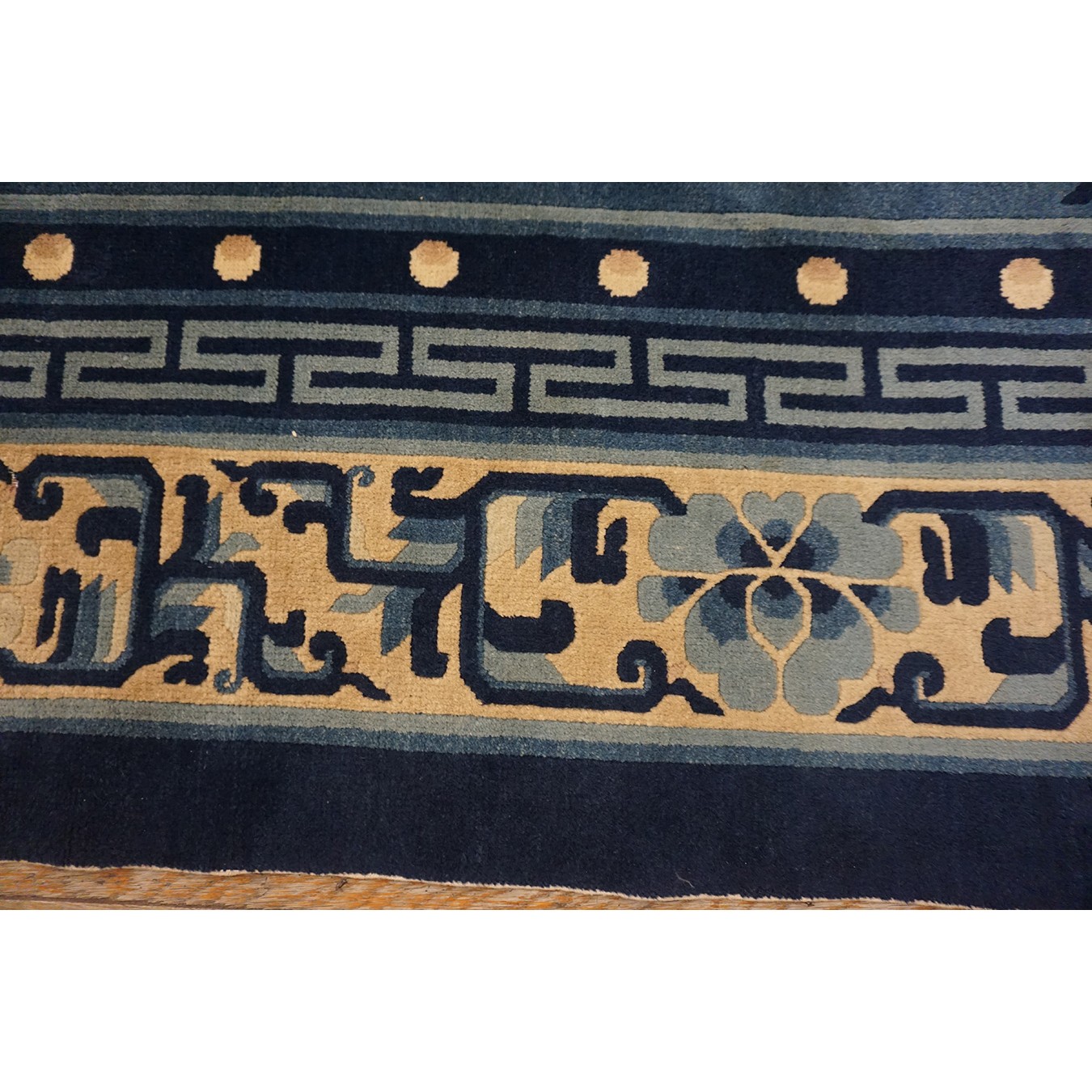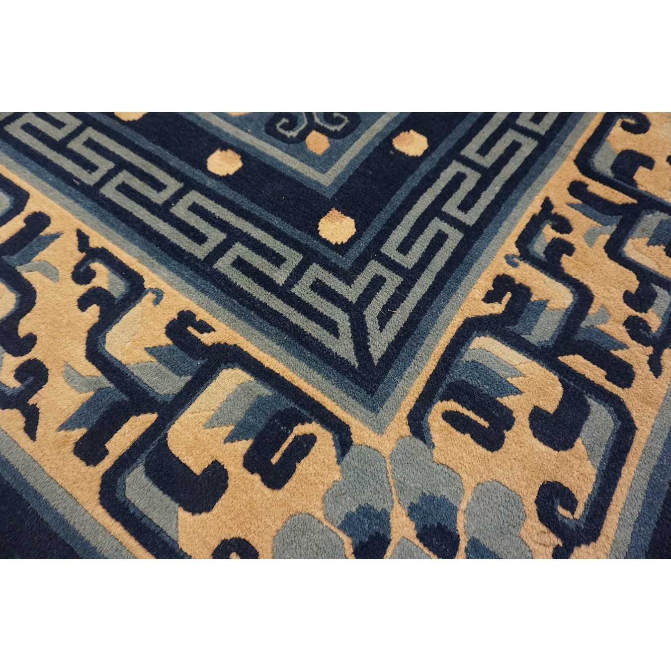 DescriptionChineseCarpets made in China proper. See entries Ningshia, Peking, Art Deco. Chinese - PekingThe commercial Peking carpet is a later 19th century development, begun by importing weaves from Ningshia (see entry) to create and export industry aimed at Western markets. The foundation is cotton and the pile is a good quality carpet wool which takes dyes particularly well. The neat medium weave is in Persian (asymmetric) knots. Designs are strictly Chinese and the whole motif repertoire of Chinese art is employed. Blue and white is the most popular color combination and red is particularly rare. Sizes tend to 9 x 12 and larger, and few small pieces appear. For a short time in the early 1920s Persian designs were woven to capitalize on the death of new Iranian goods. The industry decimated by the Communist Revolution relocated to the Pearl River area. There is a good supply of antique carpets at reasonable prices. | |