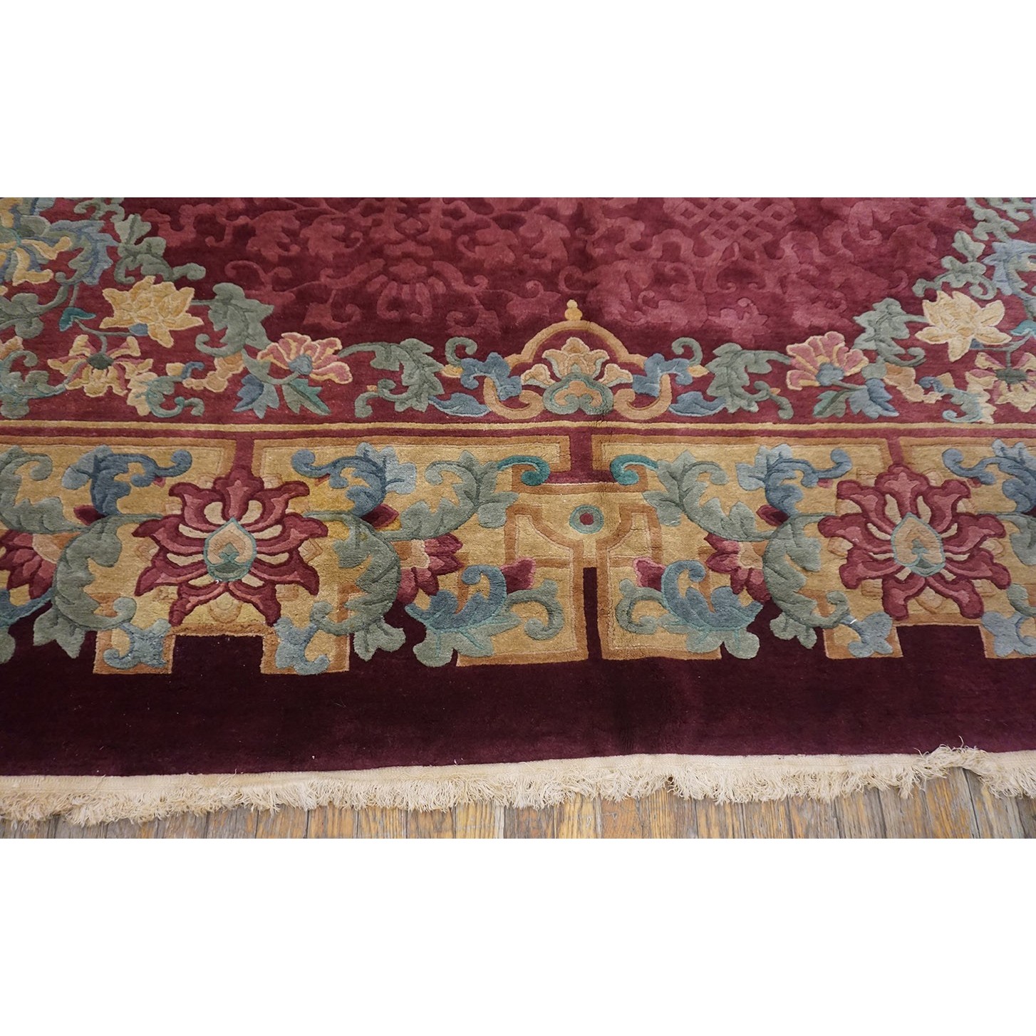 DescriptionChineseCarpets made in China proper. See entries Ningshia, Peking, Art Deco. Chinese - PekingThe commercial Peking carpet is a later 19th century development, begun by importing weaves from Ningshia (see entry) to create and export industry aimed at Western markets. The foundation is cotton and the pile is a good quality carpet wool which takes dyes particularly well. The neat medium weave is in Persian (asymmetric) knots. Designs are strictly Chinese and the whole motif repertoire of Chinese art is employed. Blue and white is the most popular color combination and red is particularly rare. Sizes tend to 9 x 12 and larger, and few small pieces appear. For a short time in the early 1920s Persian designs were woven to capitalize on the death of new Iranian goods. The industry decimated by the Communist Revolution relocated to the Pearl River area. There is a good supply of antique carpets at reasonable prices. | |