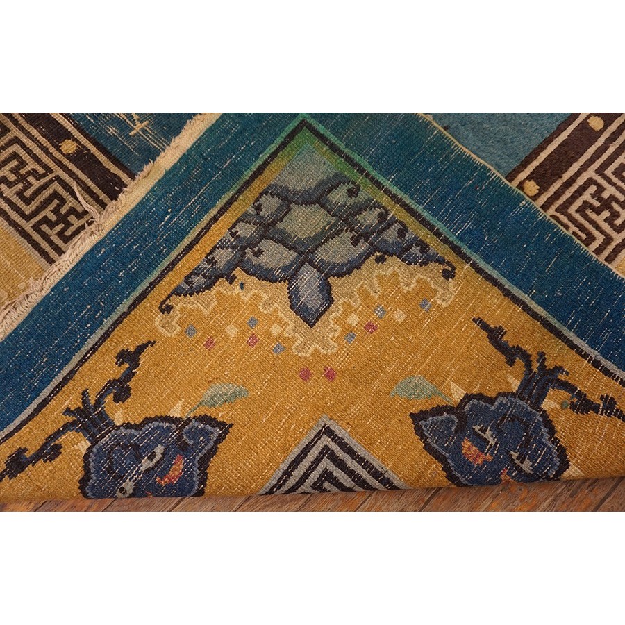 DescriptionChineseCarpets made in China proper. See entries Ningshia, Peking, Art Deco. Chinese - PekingThe commercial Peking carpet is a later 19th century development, begun by importing weaves from Ningshia (see entry) to create and export industry aimed at Western markets. The foundation is cotton and the pile is a good quality carpet wool which takes dyes particularly well. The neat medium weave is in Persian (asymmetric) knots. Designs are strictly Chinese and the whole motif repertoire of Chinese art is employed. Blue and white is the most popular color combination and red is particularly rare. Sizes tend to 9 x 12 and larger, and few small pieces appear. For a short time in the early 1920s Persian designs were woven to capitalize on the death of new Iranian goods. The industry decimated by the Communist Revolution relocated to the Pearl River area. There is a good supply of antique carpets at reasonable prices. | |