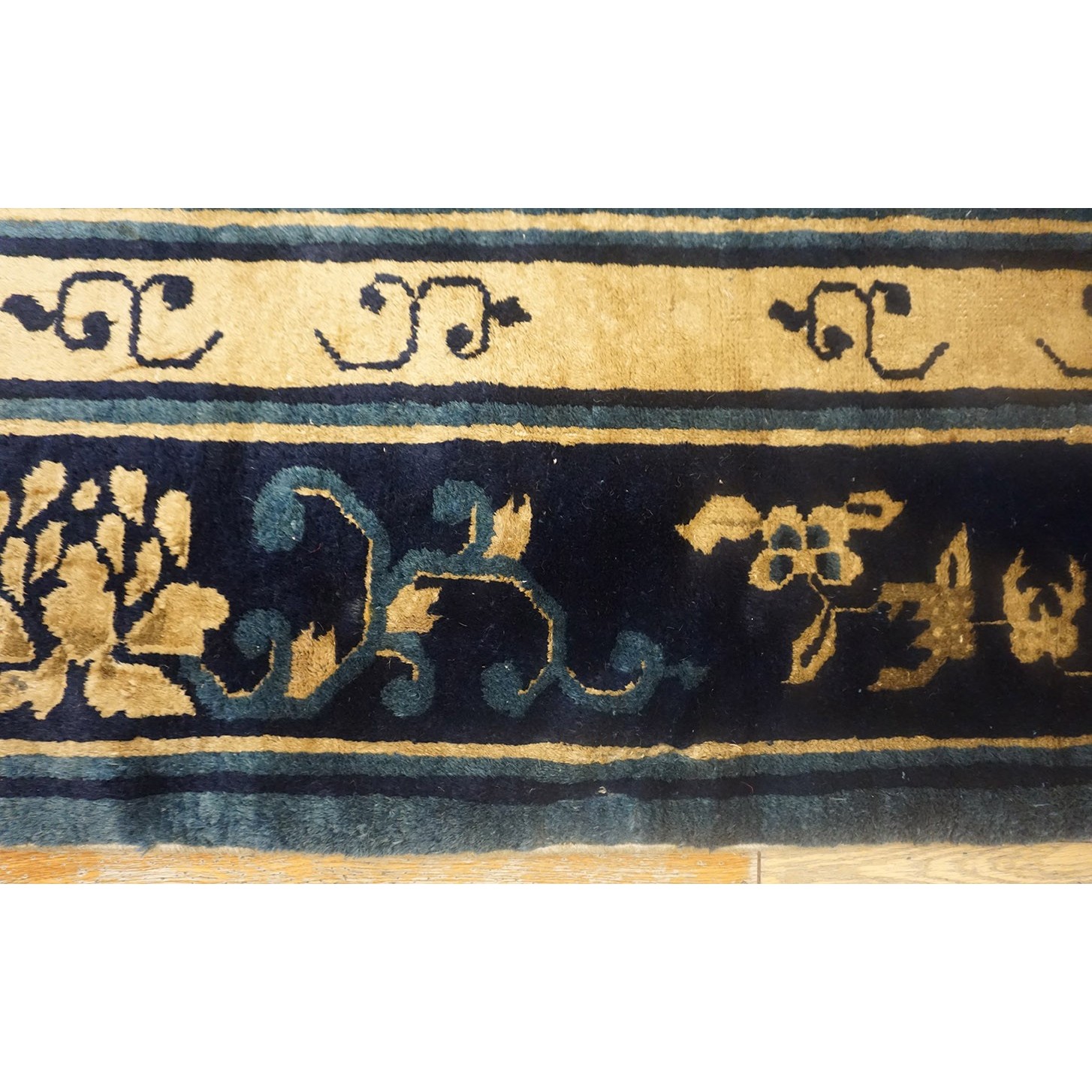 DescriptionChineseCarpets made in China proper. See entries Ningshia, Peking, Art Deco. Chinese - PekingThe commercial Peking carpet is a later 19th century development, begun by importing weaves from Ningshia (see entry) to create and export industry aimed at Western markets. The foundation is cotton and the pile is a good quality carpet wool which takes dyes particularly well. The neat medium weave is in Persian (asymmetric) knots. Designs are strictly Chinese and the whole motif repertoire of Chinese art is employed. Blue and white is the most popular color combination and red is particularly rare. Sizes tend to 9 x 12 and larger, and few small pieces appear. For a short time in the early 1920s Persian designs were woven to capitalize on the death of new Iranian goods. The industry decimated by the Communist Revolution relocated to the Pearl River area. There is a good supply of antique carpets at reasonable prices. | |