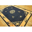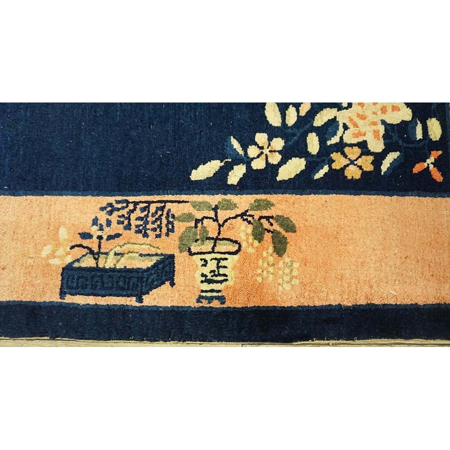 DescriptionChineseCarpets made in China proper. See entries Ningshia, Peking, Art Deco. Chinese - PekingThe commercial Peking carpet is a later 19th century development, begun by importing weaves from Ningshia (see entry) to create and export industry aimed at Western markets. The foundation is cotton and the pile is a good quality carpet wool which takes dyes particularly well. The neat medium weave is in Persian (asymmetric) knots. Designs are strictly Chinese and the whole motif repertoire of Chinese art is employed. Blue and white is the most popular color combination and red is particularly rare. Sizes tend to 9 x 12 and larger, and few small pieces appear. For a short time in the early 1920s Persian designs were woven to capitalize on the death of new Iranian goods. The industry decimated by the Communist Revolution relocated to the Pearl River area. There is a good supply of antique carpets at reasonable prices. | |