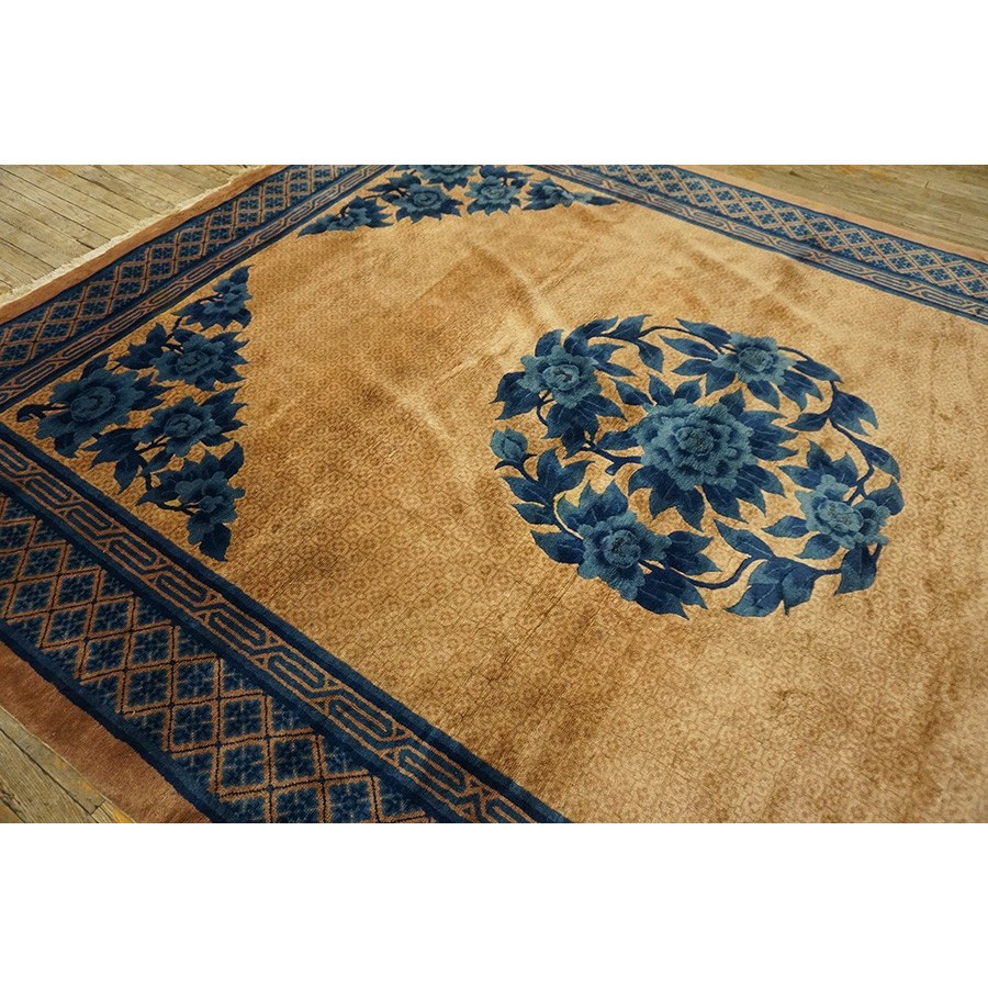 DescriptionChineseCarpets made in China proper. See entries Ningshia, Peking, Art Deco. Chinese - PekingThe commercial Peking carpet is a later 19th century development, begun by importing weaves from Ningshia (see entry) to create and export industry aimed at Western markets. The foundation is cotton and the pile is a good quality carpet wool which takes dyes particularly well. The neat medium weave is in Persian (asymmetric) knots. Designs are strictly Chinese and the whole motif repertoire of Chinese art is employed. Blue and white is the most popular color combination and red is particularly rare. Sizes tend to 9 x 12 and larger, and few small pieces appear. For a short time in the early 1920s Persian designs were woven to capitalize on the death of new Iranian goods. The industry decimated by the Communist Revolution relocated to the Pearl River area. There is a good supply of antique carpets at reasonable prices. | |
