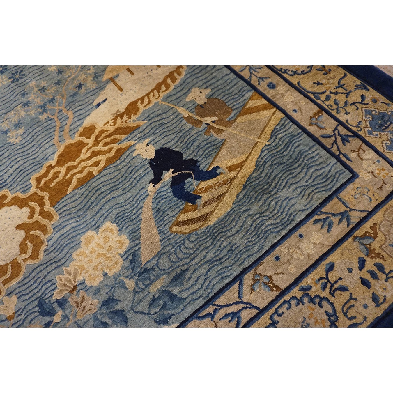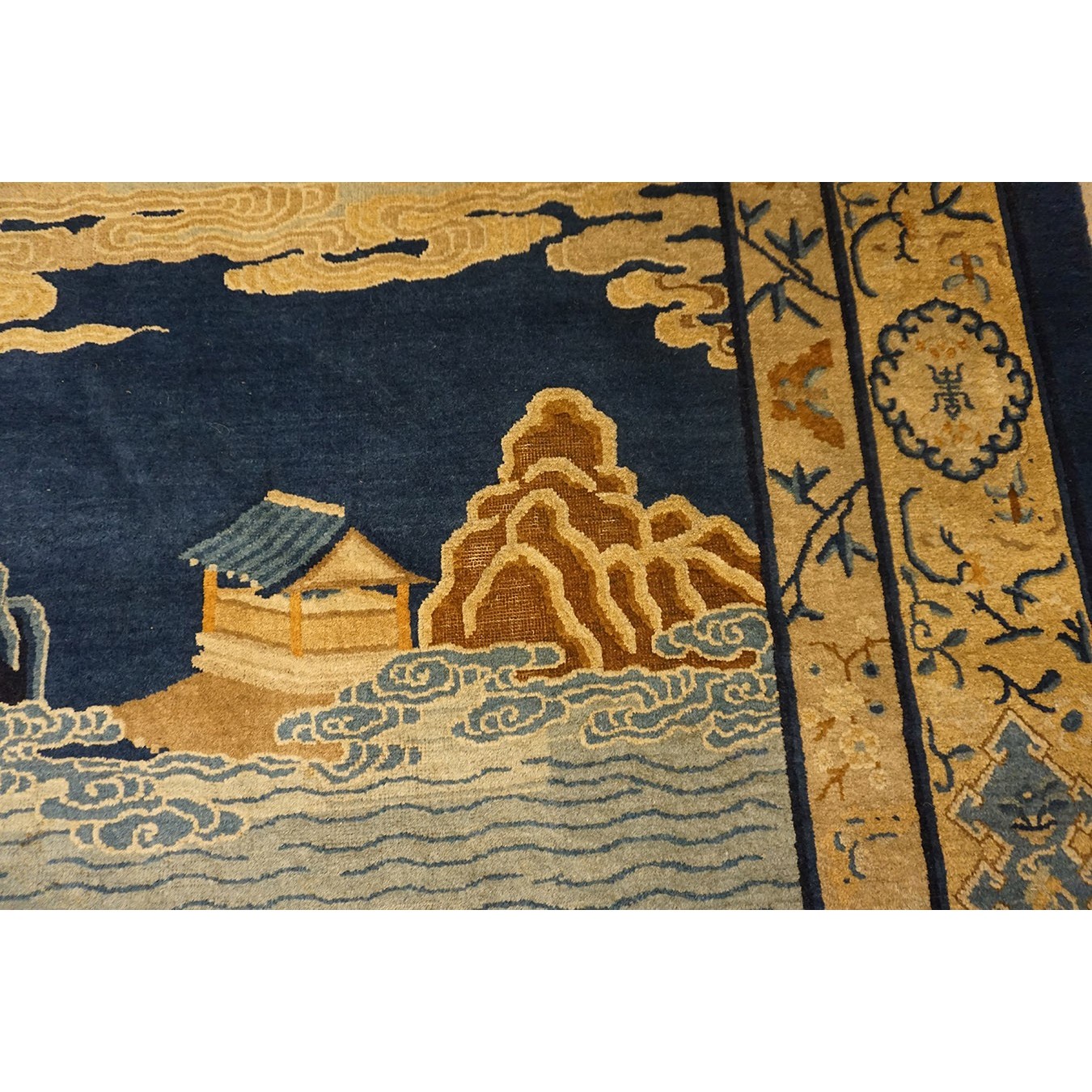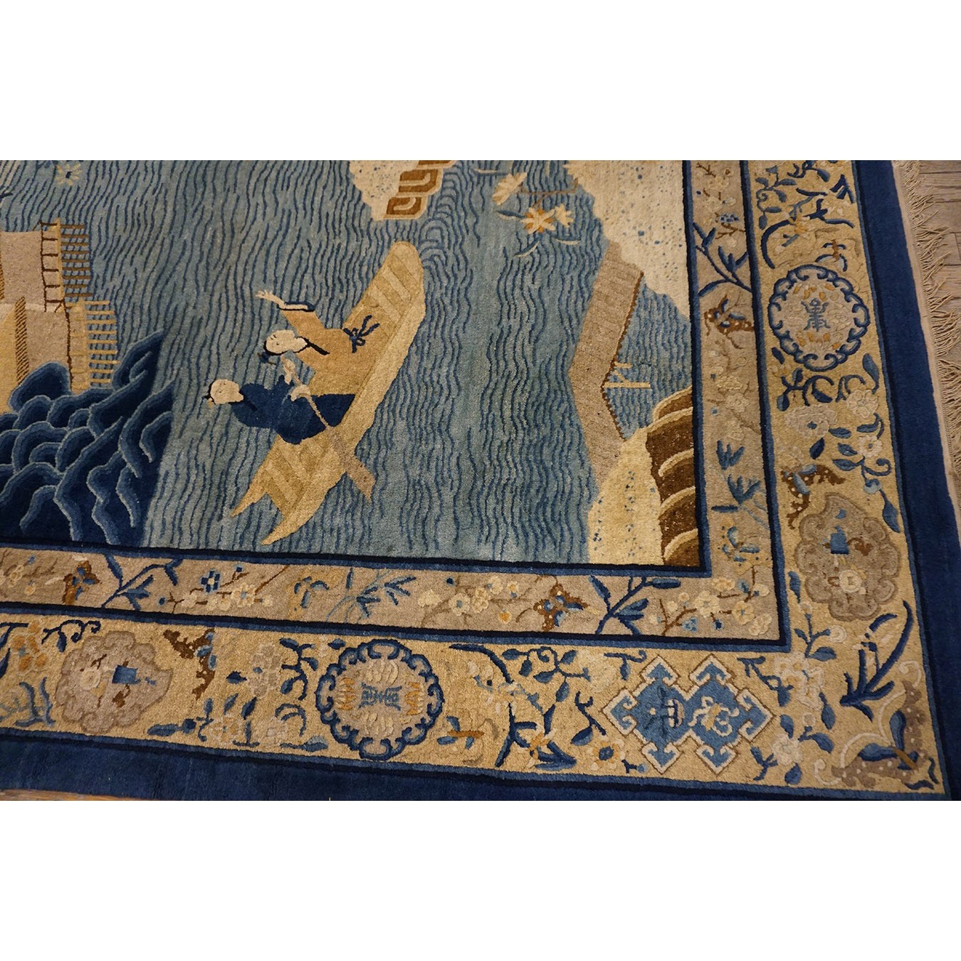 DescriptionChineseCarpets made in China proper. See entries Ningshia, Peking, Art Deco. Chinese - PekingThe commercial Peking carpet is a later 19th century development, begun by importing weaves from Ningshia (see entry) to create and export industry aimed at Western markets. The foundation is cotton and the pile is a good quality carpet wool which takes dyes particularly well. The neat medium weave is in Persian (asymmetric) knots. Designs are strictly Chinese and the whole motif repertoire of Chinese art is employed. Blue and white is the most popular color combination and red is particularly rare. Sizes tend to 9 x 12 and larger, and few small pieces appear. For a short time in the early 1920s Persian designs were woven to capitalize on the death of new Iranian goods. The industry decimated by the Communist Revolution relocated to the Pearl River area. There is a good supply of antique carpets at reasonable prices. | |