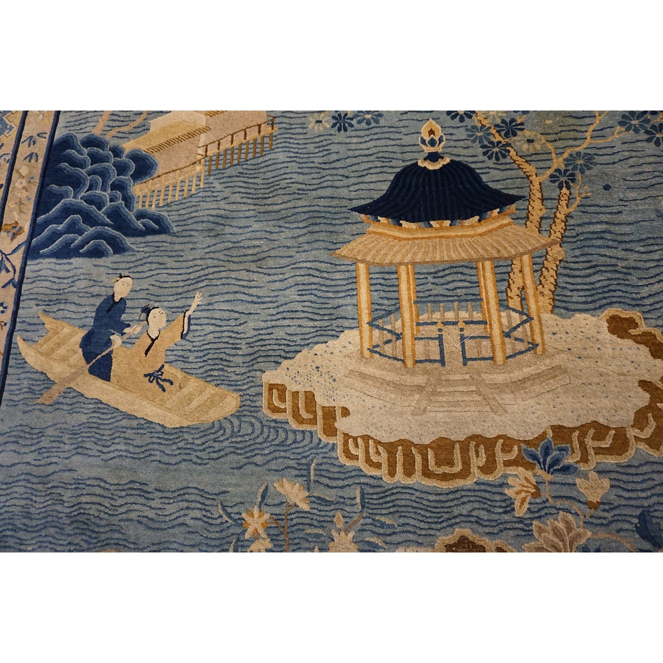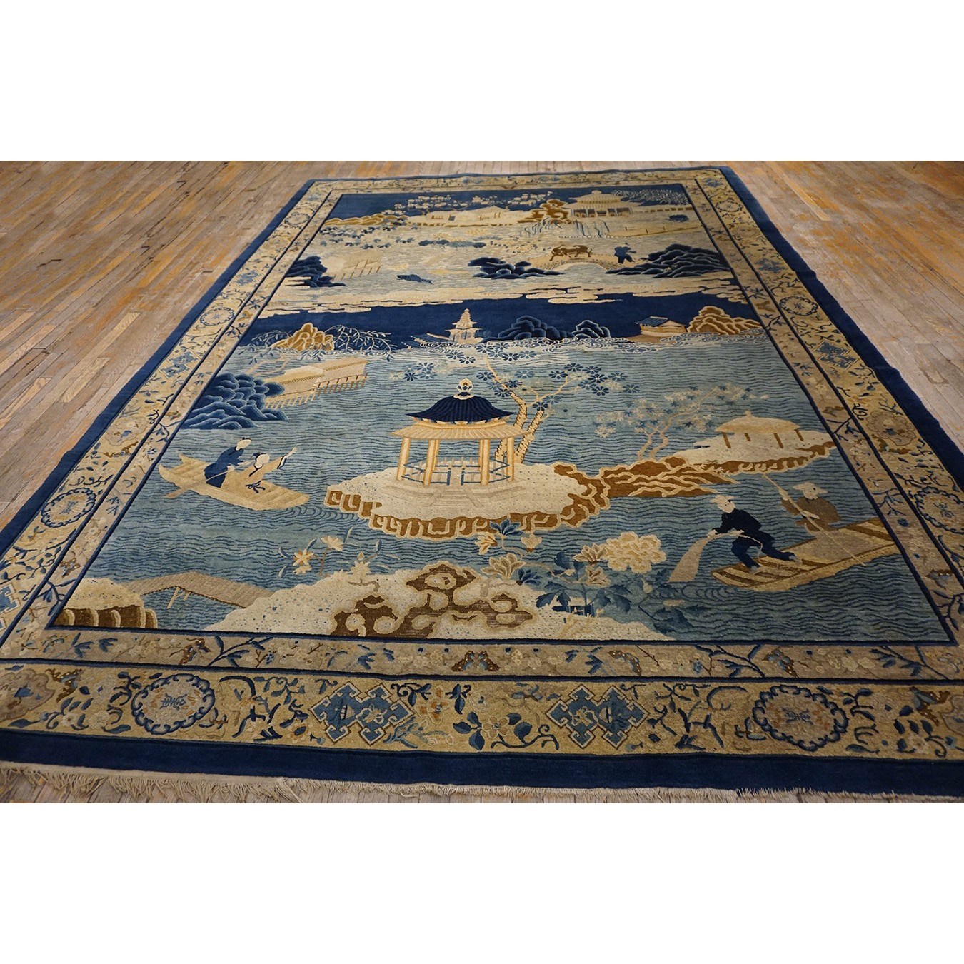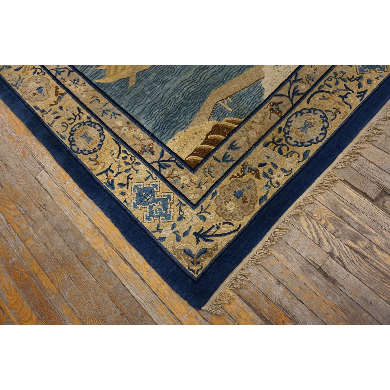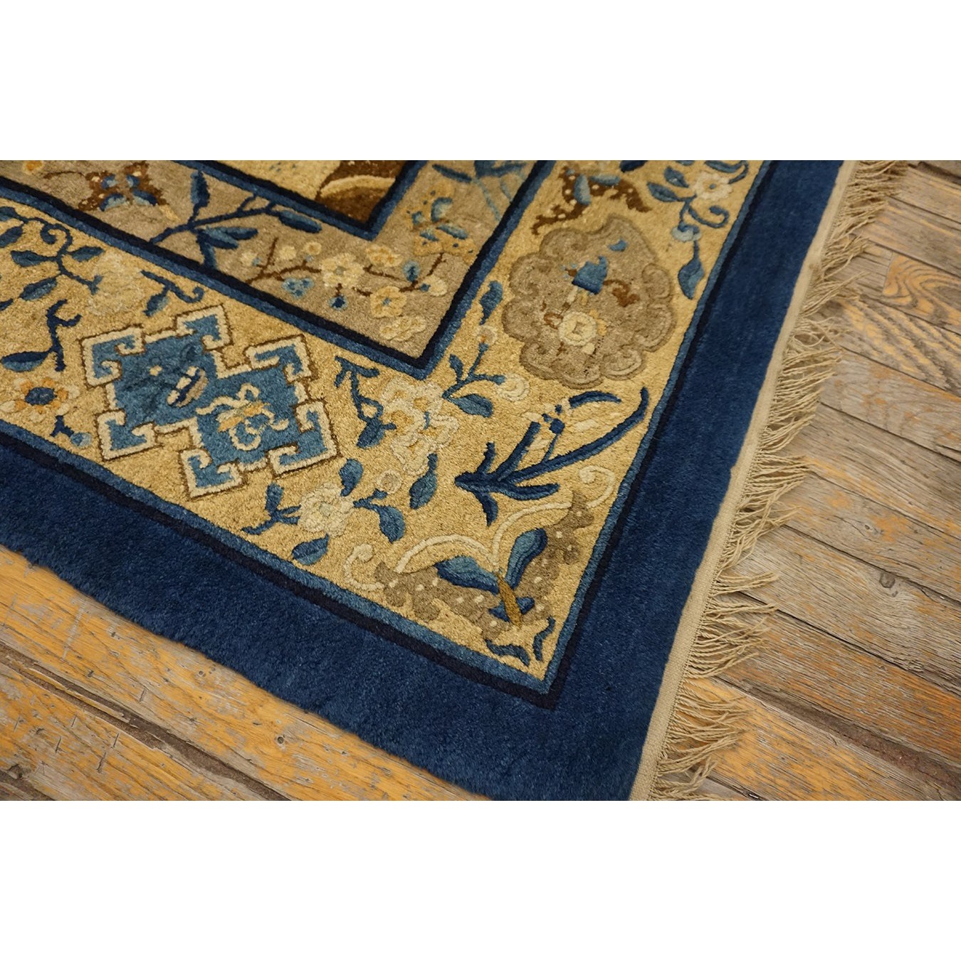 DescriptionChineseCarpets made in China proper. See entries Ningshia, Peking, Art Deco. Chinese - PekingThe commercial Peking carpet is a later 19th century development, begun by importing weaves from Ningshia (see entry) to create and export industry aimed at Western markets. The foundation is cotton and the pile is a good quality carpet wool which takes dyes particularly well. The neat medium weave is in Persian (asymmetric) knots. Designs are strictly Chinese and the whole motif repertoire of Chinese art is employed. Blue and white is the most popular color combination and red is particularly rare. Sizes tend to 9 x 12 and larger, and few small pieces appear. For a short time in the early 1920s Persian designs were woven to capitalize on the death of new Iranian goods. The industry decimated by the Communist Revolution relocated to the Pearl River area. There is a good supply of antique carpets at reasonable prices. | |