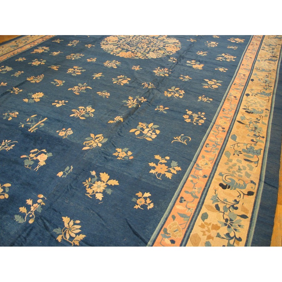 DescriptionChineseCarpets made in China proper. See entries Ningshia, Peking, Art Deco. Chinese - PekingThe commercial Peking carpet is a later 19th century development, begun by importing weaves from Ningshia (see entry) to create and export industry aimed at Western markets. The foundation is cotton and the pile is a good quality carpet wool which takes dyes particularly well. The neat medium weave is in Persian (asymmetric) knots. Designs are strictly Chinese and the whole motif repertoire of Chinese art is employed. Blue and white is the most popular color combination and red is particularly rare. Sizes tend to 9 x 12 and larger, and few small pieces appear. For a short time in the early 1920s Persian designs were woven to capitalize on the death of new Iranian goods. The industry decimated by the Communist Revolution relocated to the Pearl River area. There is a good supply of antique carpets at reasonable prices. | |