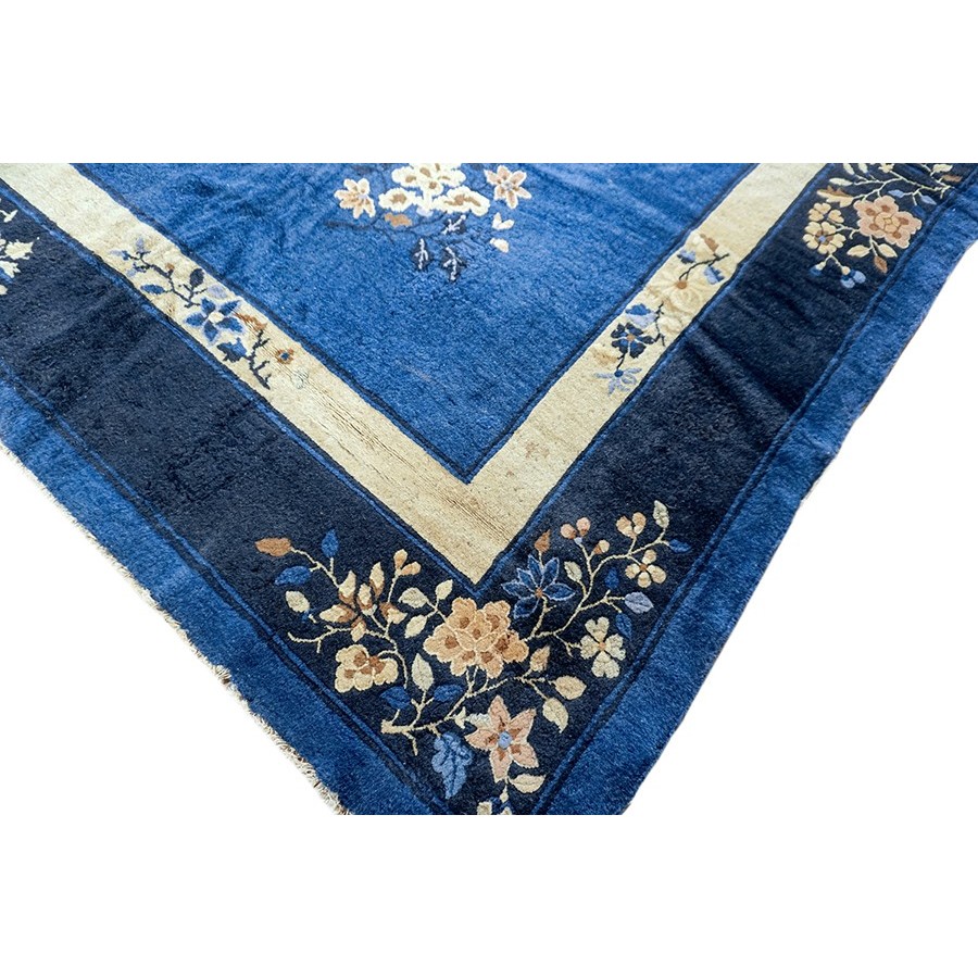 DescriptionChineseCarpets made in China proper. See entries Ningshia, Peking, Art Deco. Chinese - PekingThe commercial Peking carpet is a later 19th century development, begun by importing weaves from Ningshia (see entry) to create and export industry aimed at Western markets. The foundation is cotton and the pile is a good quality carpet wool which takes dyes particularly well. The neat medium weave is in Persian (asymmetric) knots. Designs are strictly Chinese and the whole motif repertoire of Chinese art is employed. Blue and white is the most popular color combination and red is particularly rare. Sizes tend to 9 x 12 and larger, and few small pieces appear. For a short time in the early 1920s Persian designs were woven to capitalize on the death of new Iranian goods. The industry decimated by the Communist Revolution relocated to the Pearl River area. There is a good supply of antique carpets at reasonable prices. | |