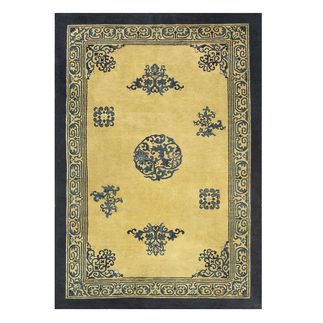 DescriptionChineseCarpets made in China proper. See entries Ningshia, Peking, Art Deco. Chinese - PekingThe commercial Peking carpet is a later 19th century development, begun by importing weaves from Ningshia (see entry) to create and export industry aimed at Western markets. The foundation is cotton and the pile is a good quality carpet wool which takes dyes particularly well. The neat medium weave is in Persian (asymmetric) knots. Designs are strictly Chinese and the whole motif repertoire of Chinese art is employed. Blue and white is the most popular color combination and red is particularly rare. Sizes tend to 9 x 12 and larger, and few small pieces appear. For a short time in the early 1920s Persian designs were woven to capitalize on the death of new Iranian goods. The industry decimated by the Communist Revolution relocated to the Pearl River area. There is a good supply of antique carpets at reasonable prices. | |