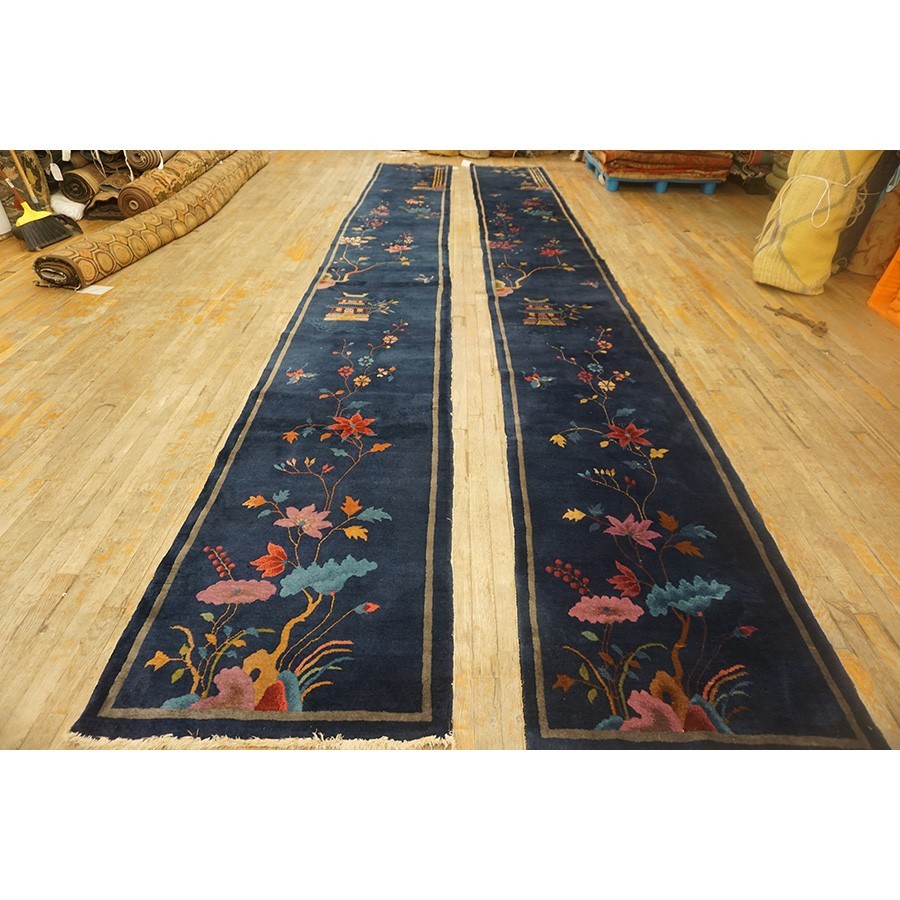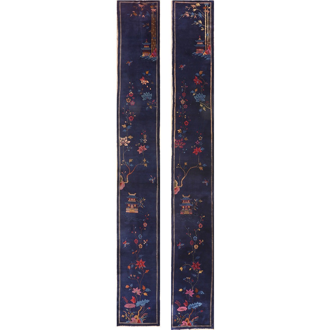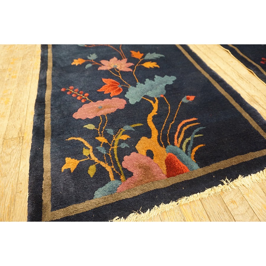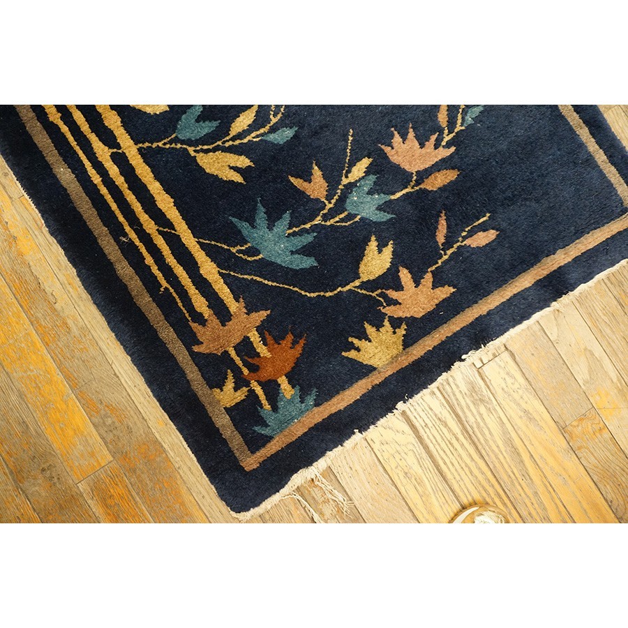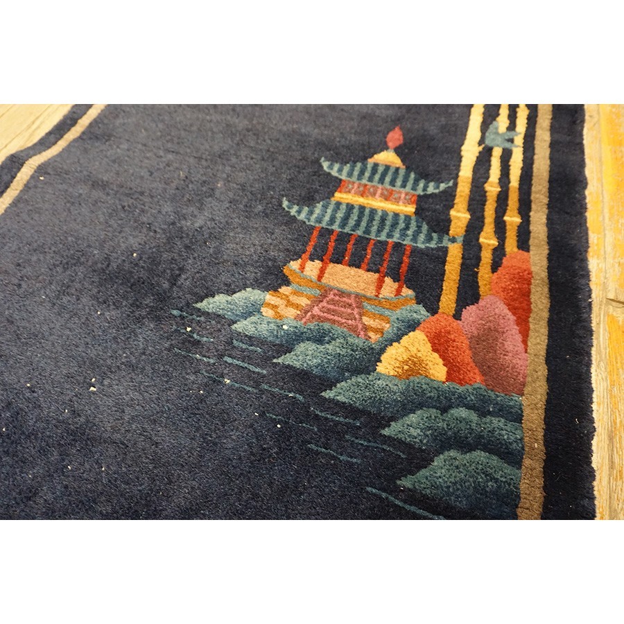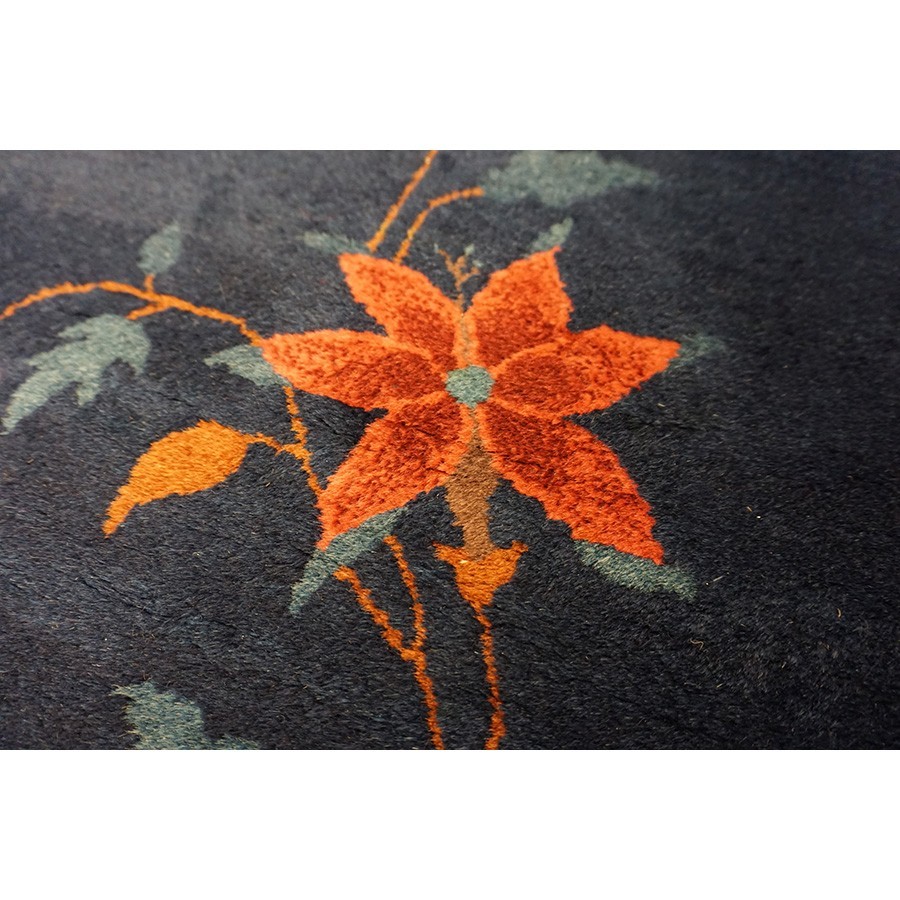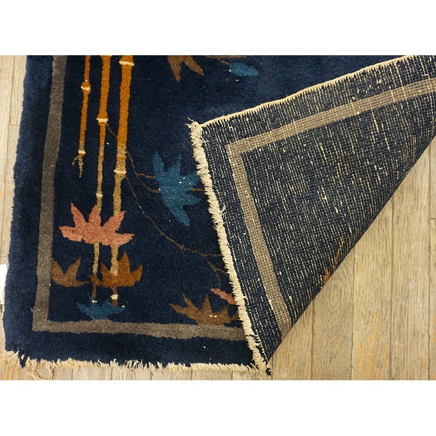 DescriptionChineseCarpets made in China proper. See entries Ningshia, Peking, Art Deco. Chinese - PekingThe commercial Peking carpet is a later 19th century development, begun by importing weaves from Ningshia (see entry) to create and export industry aimed at Western markets. The foundation is cotton and the pile is a good quality carpet wool which takes dyes particularly well. The neat medium weave is in Persian (asymmetric) knots. Designs are strictly Chinese and the whole motif repertoire of Chinese art is employed. Blue and white is the most popular color combination and red is particularly rare. Sizes tend to 9 x 12 and larger, and few small pieces appear. For a short time in the early 1920s Persian designs were woven to capitalize on the death of new Iranian goods. The industry decimated by the Communist Revolution relocated to the Pearl River area. There is a good supply of antique carpets at reasonable prices. | |