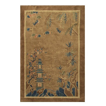 DescriptionChineseCarpets made in China proper. See entries Ningshia, Peking, Art Deco. Chinese - PekingThe commercial Peking carpet is a later 19th century development, begun by importing weaves from Ningshia (see entry) to create and export industry aimed at Western markets. The foundation is cotton and the pile is a good quality carpet wool which takes dyes particularly well. The neat medium weave is in Persian (asymmetric) knots. Designs are strictly Chinese and the whole motif repertoire of Chinese art is employed. Blue and white is the most popular color combination and red is particularly rare. Sizes tend to 9 x 12 and larger, and few small pieces appear. For a short time in the early 1920s Persian designs were woven to capitalize on the death of new Iranian goods. The industry decimated by the Communist Revolution relocated to the Pearl River area. There is a good supply of antique carpets at reasonable prices. | |