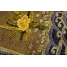 Most of the silk and metal thread rugs, ostensibly, according to their inscriptions, made for the Imperial palaces in the Forbidden City, display five writhing, scaly dragons, one central and full face, the others more in profile in the corners, all executed in knotted silk pile on flat-woven gold grounds This one, in perfect condition, shows a meditating Buddha with an enormous flaming halo, seated in a Lotus Position, between stipple shaded rocky mounds displaying irises/ peonies. Above is an umbrella signifying royalty, and scattered about are cloud bands, cloud knots and precious objects including: a cord knot, vase, wheel and scroll (?). At the bottom of the field is a scalloped and frothy sea with curling surf and droplets of foam. The usual stylized mountain rising from the waves is absent, replaced by a wave peak.