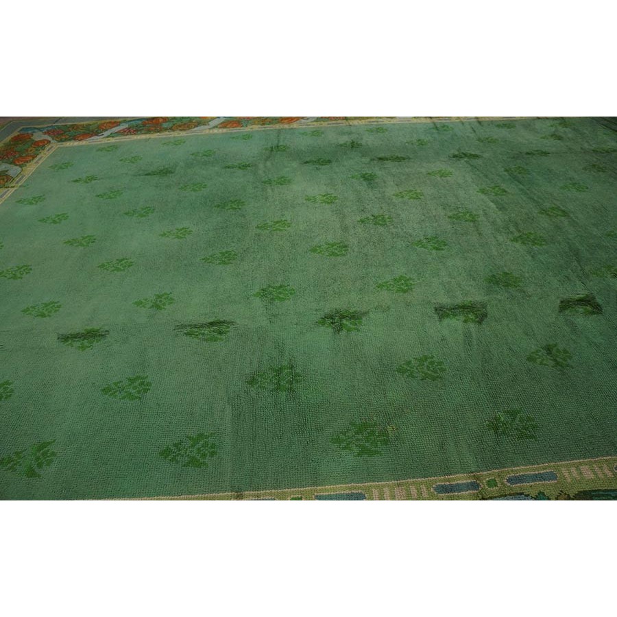 The Irish Guiness green field shows a widely spaced one way small red flower allover pattern. Although many Donegals show distinctly Celtic or Oushak designs, this example is more in the French Savonnerie manner. The unusual main border is quasi-three-dimensional, with a ribbon guillotine around a red and green rose and leaf continuous bouquet. The pile is lush and deep, with symmetric (Turkish) knots on an all-wool foundation.