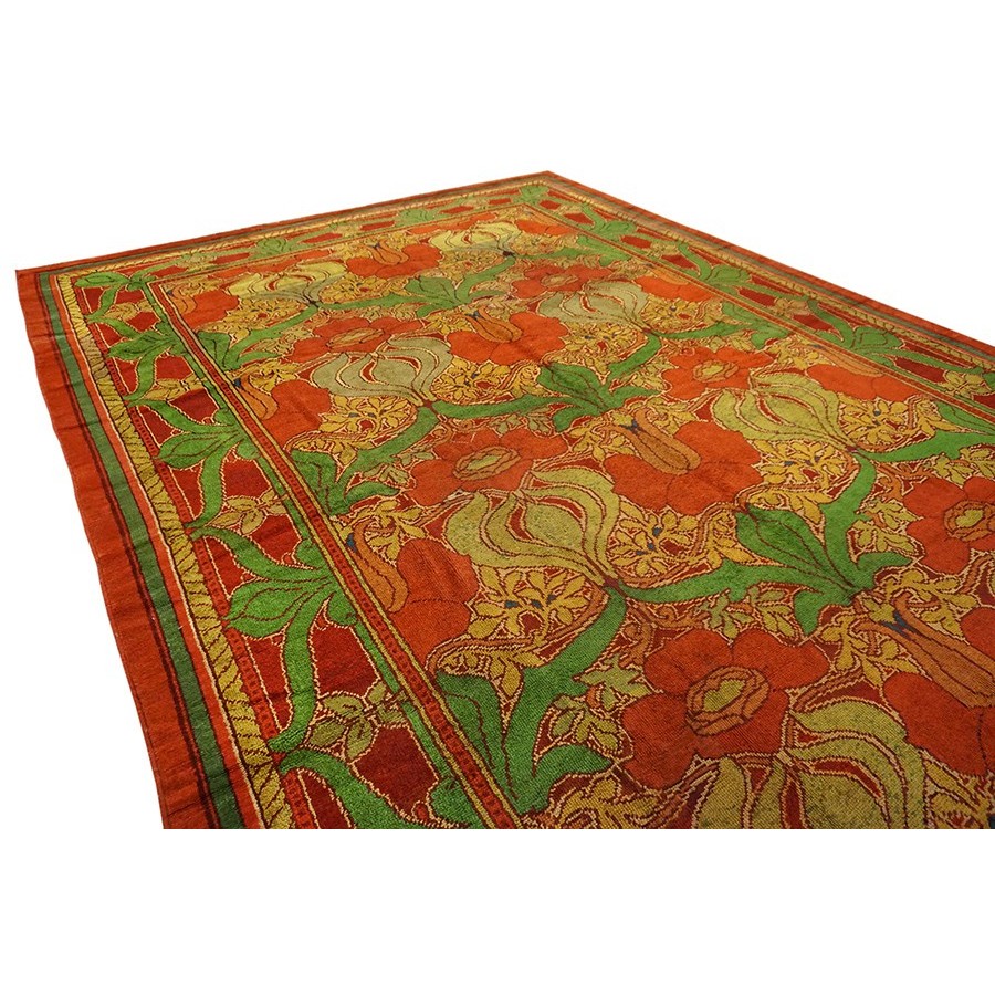 This is one of the most attractive of the Donegal Arts and Crafts carpets, the “Donnemara” here with a barely visible rust ground overlaid with three full and two partial lateral columns of fleshy, stenciled, compound palmettes. Turkish-style tulips adorn the central and side axes. Onion-style leaves support the red “batwing” palmettes in the two adjacent columns. The green border shows lotus palmettes controlled by a thick, plain strapwork arabesque. The style overall is neither Celtic Revival nor Oushak takeoff. The design is unidirectional. As in all Donegal weavings, they were executed by local women on vertical wooden looms, using local wool. A cartoon must have been necessary at the start, but the weavers quickly got the hang of it. This particularly large carpet probably took a team of five weavers six of seven months to complete. There are four distinct colourways known, And the sixes may vary with three pattern repeats. The Donnemara was retailed exclusively by Liberty of London. Any surviving carpets, no matter their present locations, must have initially passed through Liberty. Unlike the Oushak-style Donegals, the pattern is more textile-like and the field is almost entirely covered. This connects it more to the Morris Arts and Crafts tradition rather than to a historizing Celtic/Anatolian trend. Here there is no attempt at shading or layering of pattern, everything is flat, two-dimensional and without depth. The Donnemara type is one of the several designs woven exclusively for Liberty. All share this wall-paper style of drawing. The pile is thick and the rug is in good condition with no visible repairs.
