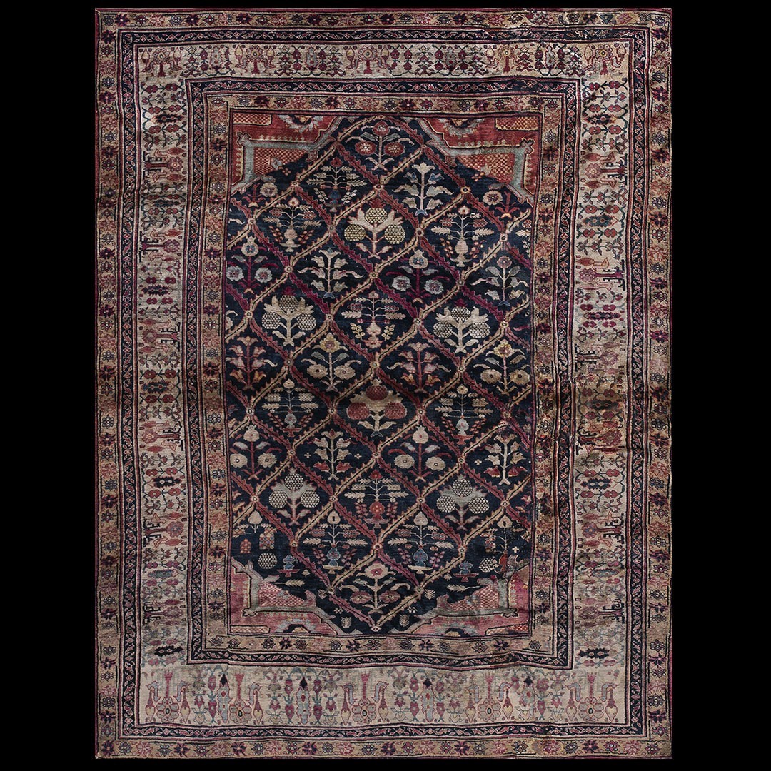 DescriptionHeriz - SilkFrom the first quarter of the 19th century until the beginning of the 20th century, a select group of silk pile, silk foundation rugs was woven in the Heriz area in northwest Iran. More flexible in handle than silk Tabriz rugs, they have brighter colors and more idiosyneratic drawing often related to their coarser woolen cousins, weaves vary. But very fine examples count 500 knots per square inch. As rustic products they share a playfulness and naiveté foreign to their factory-made contemporaries from Tabriz. Sizes run from scatters up to 12 x 18 and designs are diverse. Often found in excellent condition, they are deservedly quite pricey. | |