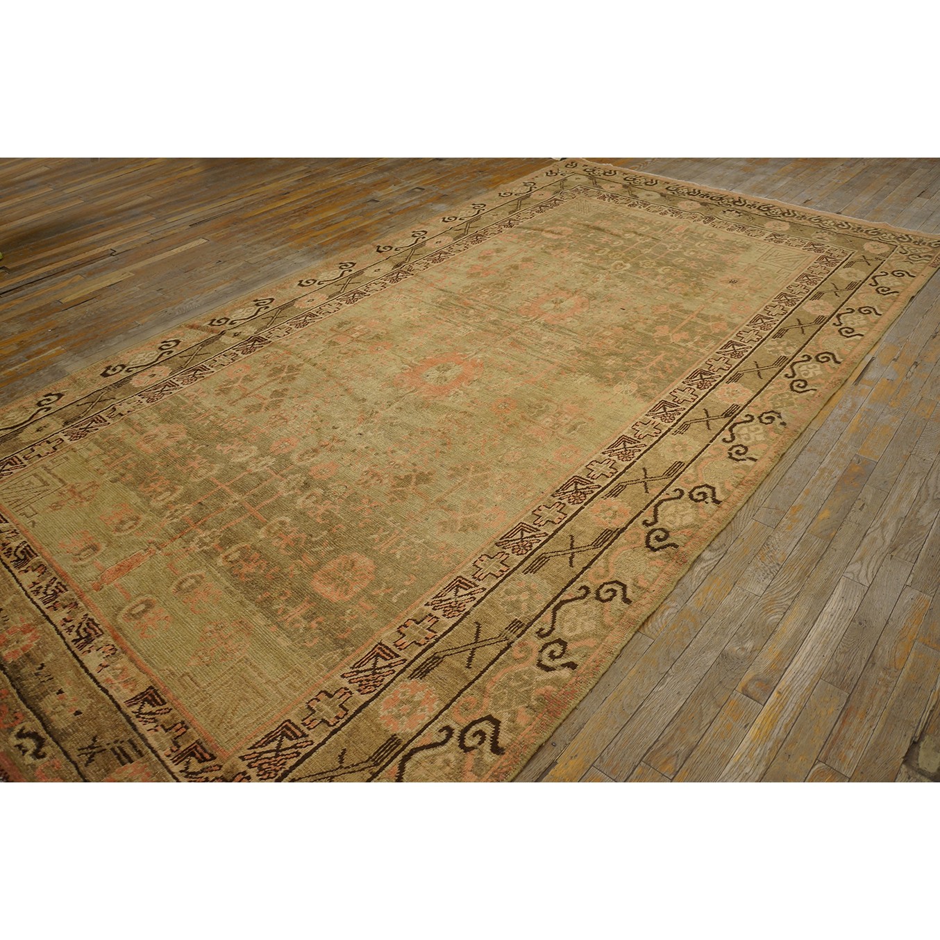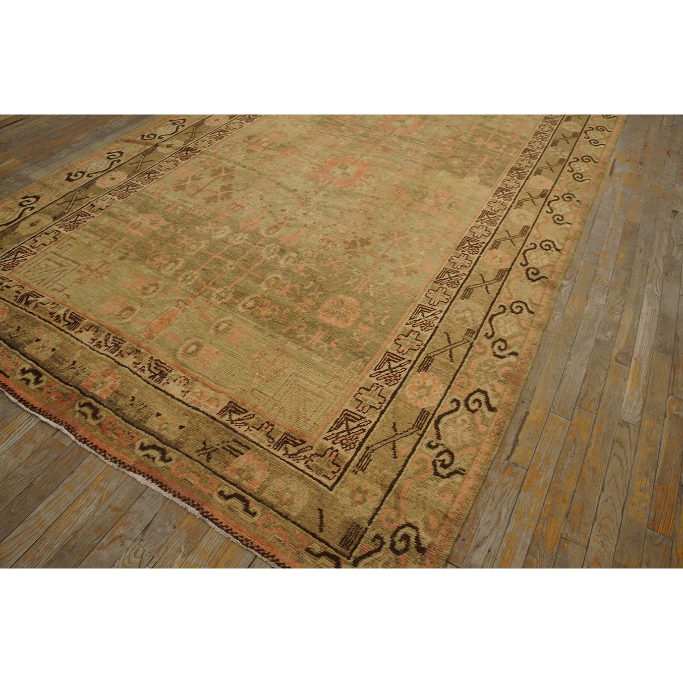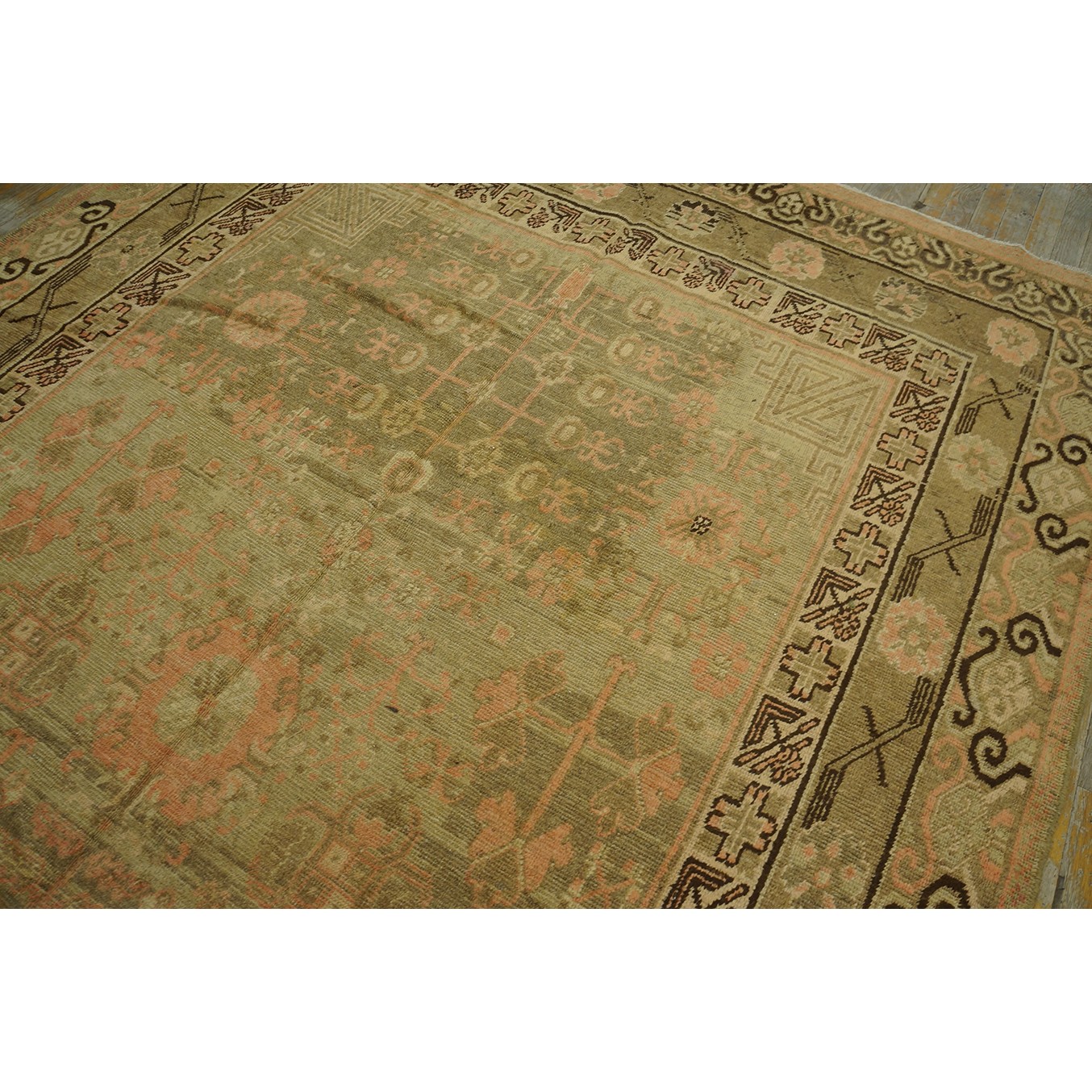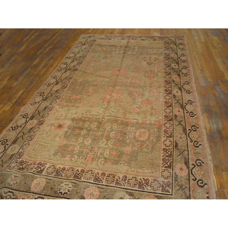 DescriptionChineseCarpets made in China proper. See entries Ningshia, Peking, Art Deco. KhotanThe innermost of the trio of Silk Road cities (with Kashgar and Yarkand), Khotan weaves carpets mostly in the 6 x 12 size with recognizable Chinese iconography, but with central Asian elements and in brighter colors with distinct wool and handle. Later examples use synthetic dyes which have been treated to mellow the colors. Although this later period is not collectible, it is much in demand decoratively. A few smaller rugs and chair seat (2 square) are also encountered. | |