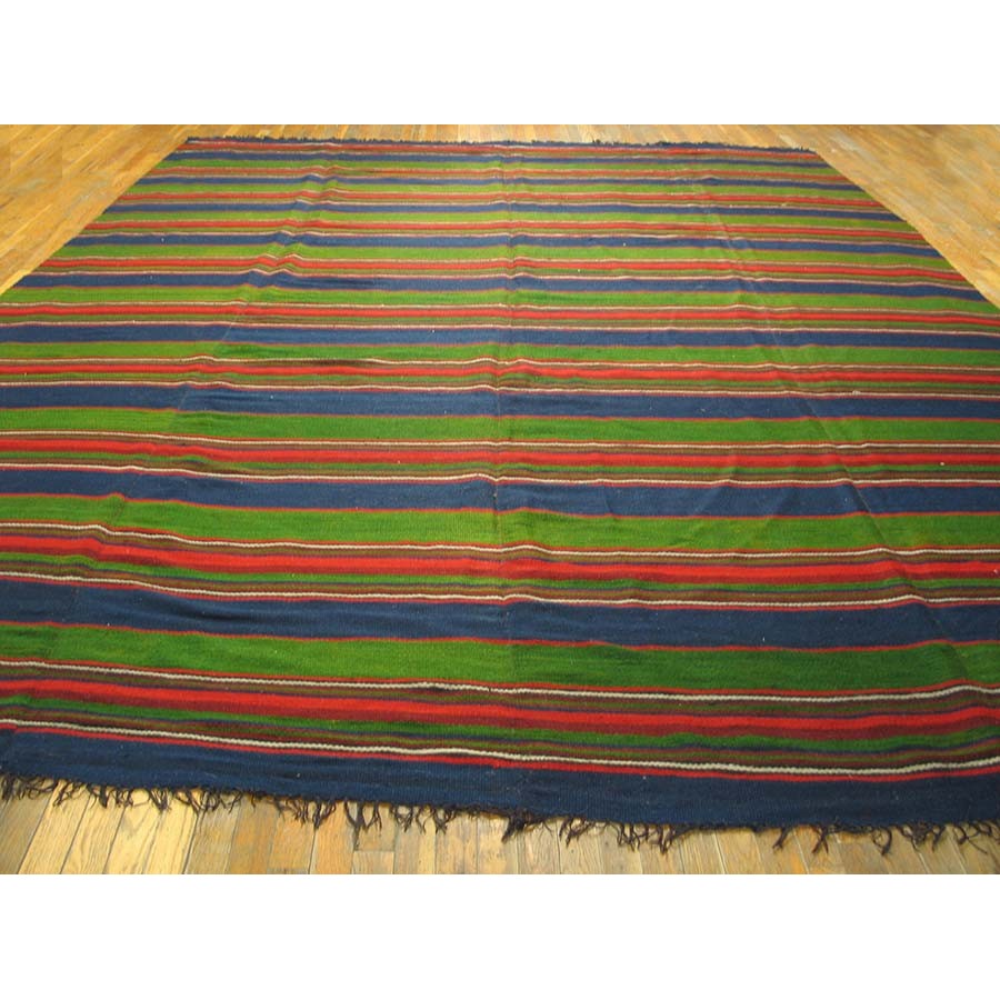 Woven in one piece, with horizontal stripes of medium blue, red, orange, ivory and black, this village flat-woven carpet looks totally up-to-date although in fact it was woven c. 1930. Room size old kilims are uncommon and this one is in top condition, with no disturbing patches or reweaves.