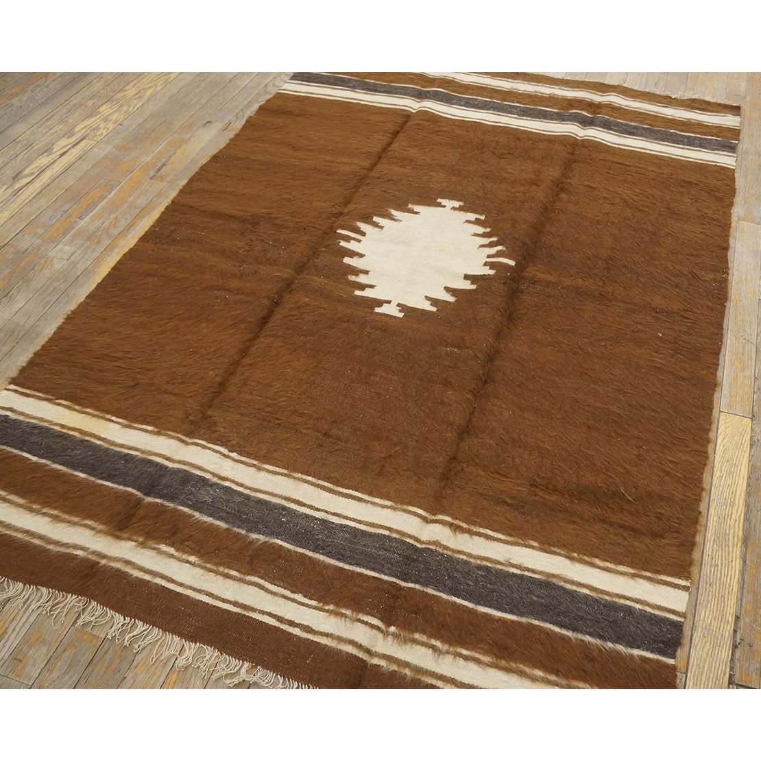 DescriptionKilimGenerically, are pileless, flat rug woven in a tapestry technique whether or not the color pattern joins are left open, or the slits are closed by interlocking or warp sharing. The technique is used all over the rug belt for quickly made simply patterned, inexpensive pieces. (Senha Kilims are the exception.) Kilims are made everywhere Turkey, the Caucasus, Iran, Afghanistan. The India dhurrie is a form of kilim and in the new world Navajo and Rio Grande blankets and rugs are also kilims. Designs are structurally determined and hence usually geometric, excepting the more delicate and curvilinear senha kilims. Besides use as floor coverings, kilims may be used for saddle bags and decorative hangings (pardeh), among other native uses. | |