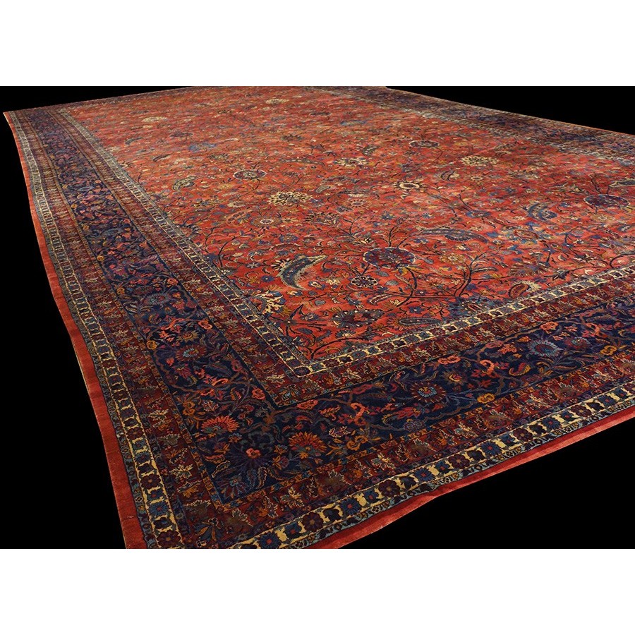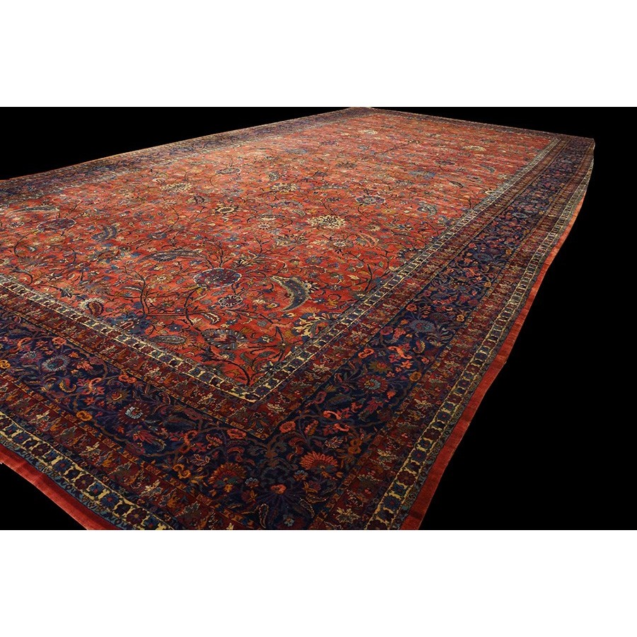 The colour scheme of this giant rug is rich and complex, with a wine red field and royal blue major border. Allover designs were a Kerman specialty and no other area can match the complexity and innovation in the best rugs from this southeastern Persian city. Lancet leaves, various styles of palmettes and untold minor devices ornament the field and inspire the borders. This enormous carpet was clearly a commissioned order rasther than woven for a dealer’s stock. It is in excellent condition with a fine, regular weave.