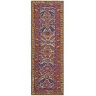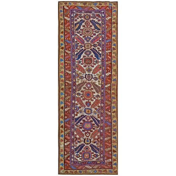 This low pile piece has a pattern repeat of four leaves springing from a central rosette, making a segment of a lozenge lattice, on an off white ground. The red border has copied the #Caucasian chalice and slant leaf #design accurately. The yellow outer border with an undulating design is more Persian. This long rug is a particularly colorful example of a desirable type.