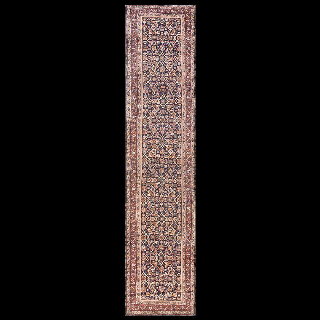 DescriptionMahalPrecisely, this is the intermediate grade of carpet between Sarouks and Mushkabads from the Ferahan plain area. Arak Province, western Persia. Woven in large quantities in room sizes, the patterns tend to be overall repeats in traditional and innovative styles. Those pieces with slightly softer colors and bigger, bolder patterns are often called Ziegler Mahals. For the late 19th century onwards, production was very substantial, thousands of carpets per year, and prices for most pieces are moderate. The usual jewel tones predominate unless the piece has been exposed to light and washing, or to an initial chemical treatment. Mahals are popular everywhere and the overall patterns make them excellent for dining rooms. | |