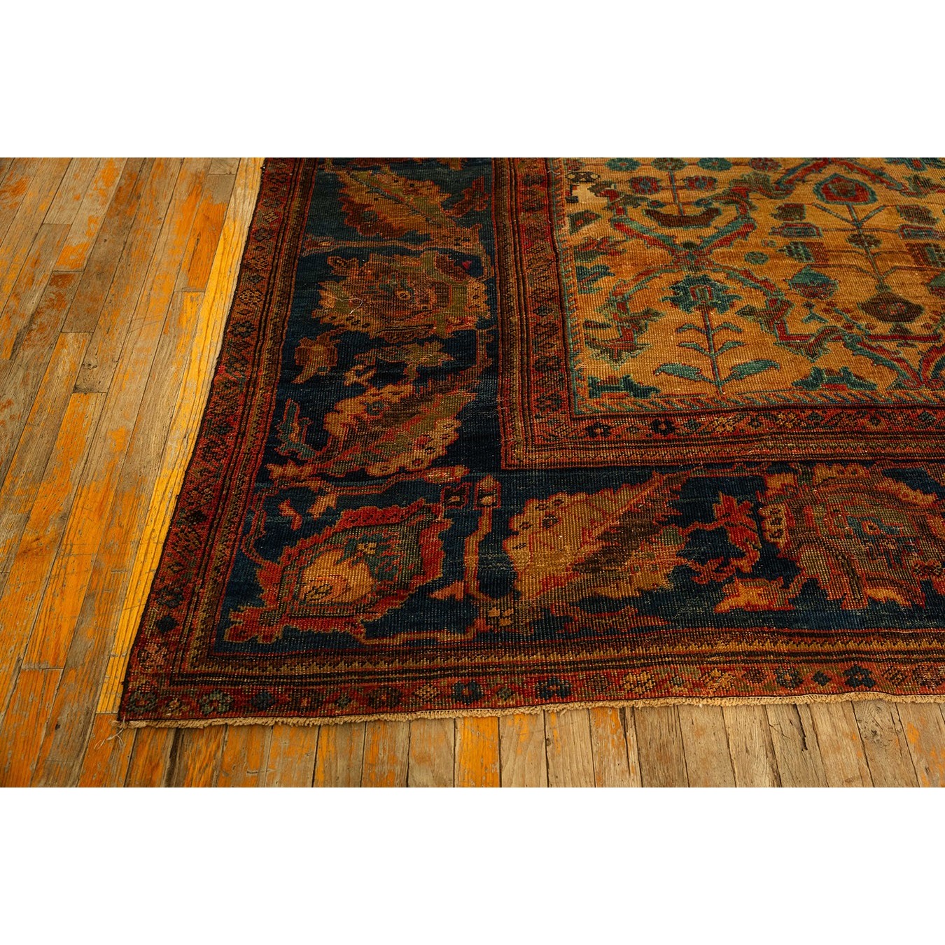 DescriptionMahalPrecisely, this is the intermediate grade of carpet between Sarouks and Mushkabads from the Ferahan plain area. Arak Province, western Persia. Woven in large quantities in room sizes, the patterns tend to be overall repeats in traditional and innovative styles. Those pieces with slightly softer colors and bigger, bolder patterns are often called Ziegler Mahals. For the late 19th century onwards, production was very substantial, thousands of carpets per year, and prices for most pieces are moderate. The usual jewel tones predominate unless the piece has been exposed to light and washing, or to an initial chemical treatment. Mahals are popular everywhere and the overall patterns make them excellent for dining rooms. | |
