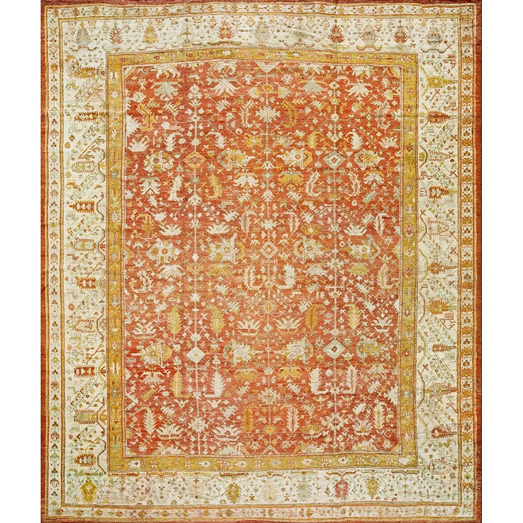 The Turkey red ground works splendidly with the light blue of the palmettes, angular lancet leaves and snippets of floral vines. There is a central organizing axis and two more expicit lateral poles. The wide ivory main border displays two species of cypresses and intervening hyacinth sprays. The bright orange helps to date the rug to the later 19th century. This is an attractive west Anatolian essay at a general Persian style carpet.