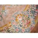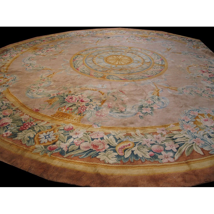 Large, round antique high pile Savonneries carpets are rare. The four-layer round medallion shows a rosette, laurel leaves and ribbons, and loops, on a tan ground decorated with basket-bouquets and flowering garlands. Densely packed wreaths punctuate the composite vegetal border. The border seems more raised, the field lower. Gold, cream and rust are among the many detail tones on this clearly unique antique Savonnerie carpet for a very special room.