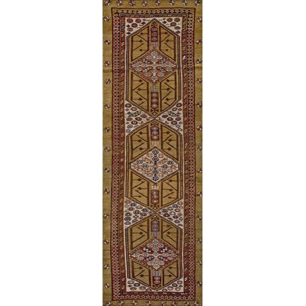 DescriptionSerabThis town on the edge of the Heriz area in Northwest Iran now almost exclusively weave runners in a restricted design range with a major use of camel tones in both field and border. This style and formality can be traced continuously back almost 200 years. Thus 19th century pieces can easily be chronologically located. Older pieces are all wool, but more modern rugs are on a cotton foundation. The pile is of high quality wool, compact. Turkish knotted and long wearing. Serab runners are among the worst recognizable and popular of Persian rugs. | |