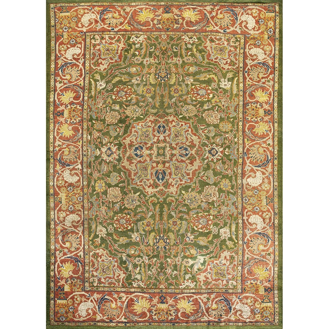 DescriptionSultanabadArak province in western Iran encompasses the town of Sultanabad and various satellite villages, all of which weave for export:the sarouk, Mahal and MushKabad. The latter two grades comprise the sultanabad production. Virtually all are large carpets, up to 16 x 25, with overall, or medallions on decorated or open fields, in soft to bright colors on a cotton foundation, the pile is lowish. The design corpus includes the ever popular Herati, the Harshang palmette motif, rosettes and arabesques, small repeated medallions, etc. The weave varies from coarse to medium. Today, the soft colored pieces with bold patterns are particularly favored. Prices range widely, low for commercial pieces 50 years old, astronomical for light colored Zieglers (see below). | |
