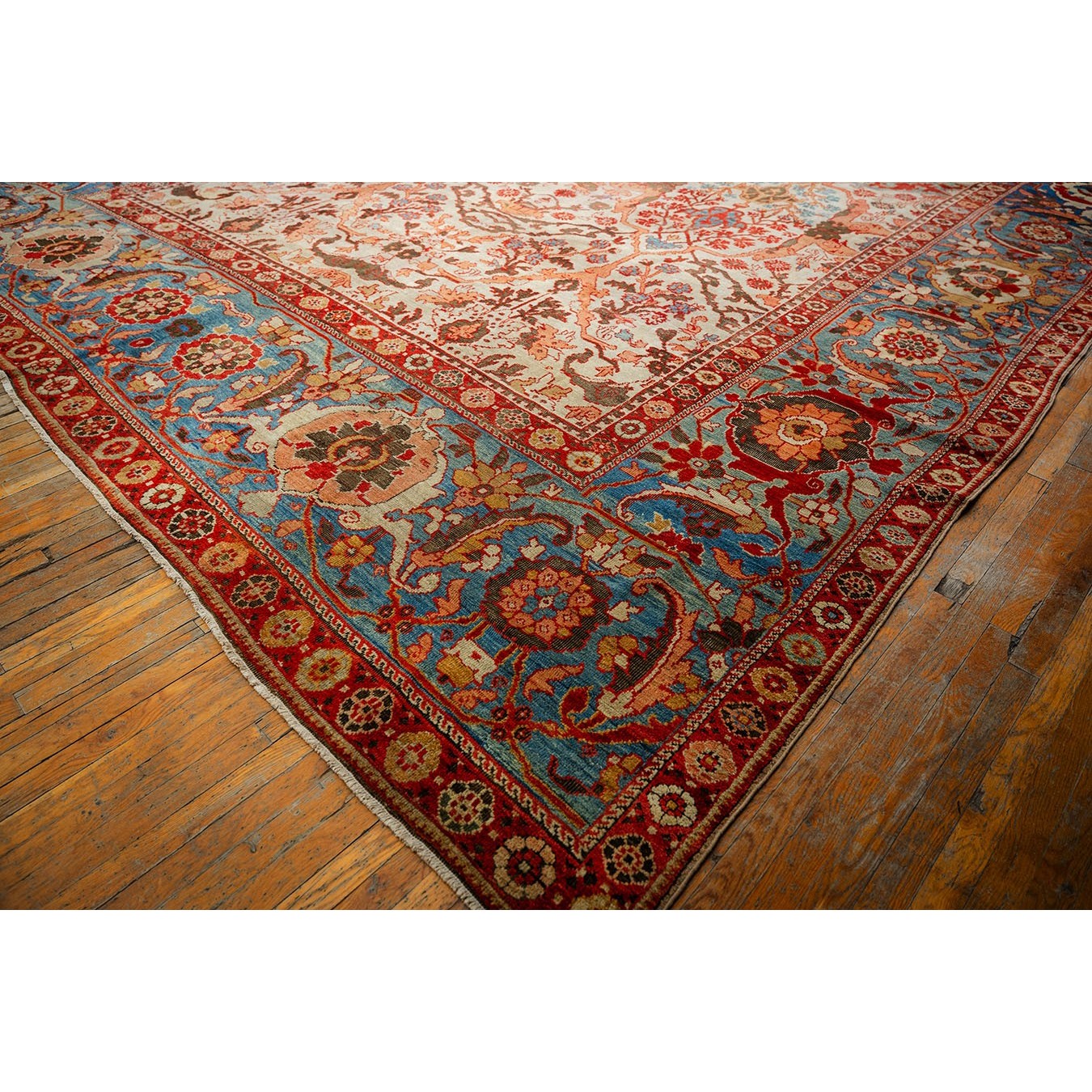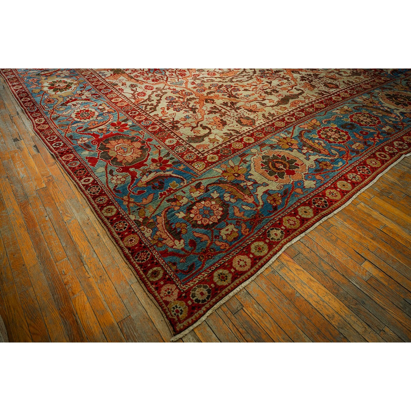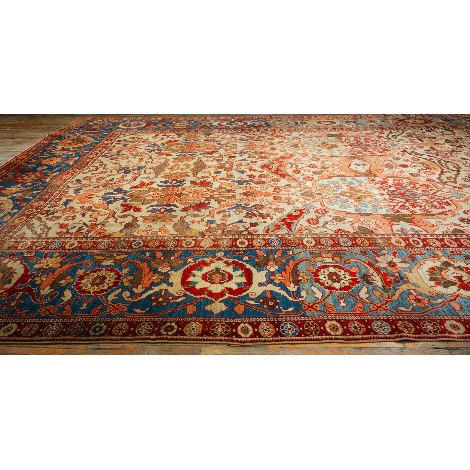 DescriptionSultanabadArak province in western Iran encompasses the town of Sultanabad and various satellite villages, all of which weave for export:the sarouk, Mahal and MushKabad. The latter two grades comprise the sultanabad production. Virtually all are large carpets, up to 16 x 25, with overall, or medallions on decorated or open fields, in soft to bright colors on a cotton foundation, the pile is lowish. The design corpus includes the ever popular Herati, the Harshang palmette motif, rosettes and arabesques, small repeated medallions, etc. The weave varies from coarse to medium. Today, the soft colored pieces with bold patterns are particularly favored. Prices range widely, low for commercial pieces 50 years old, astronomical for light colored Zieglers (see below). | |